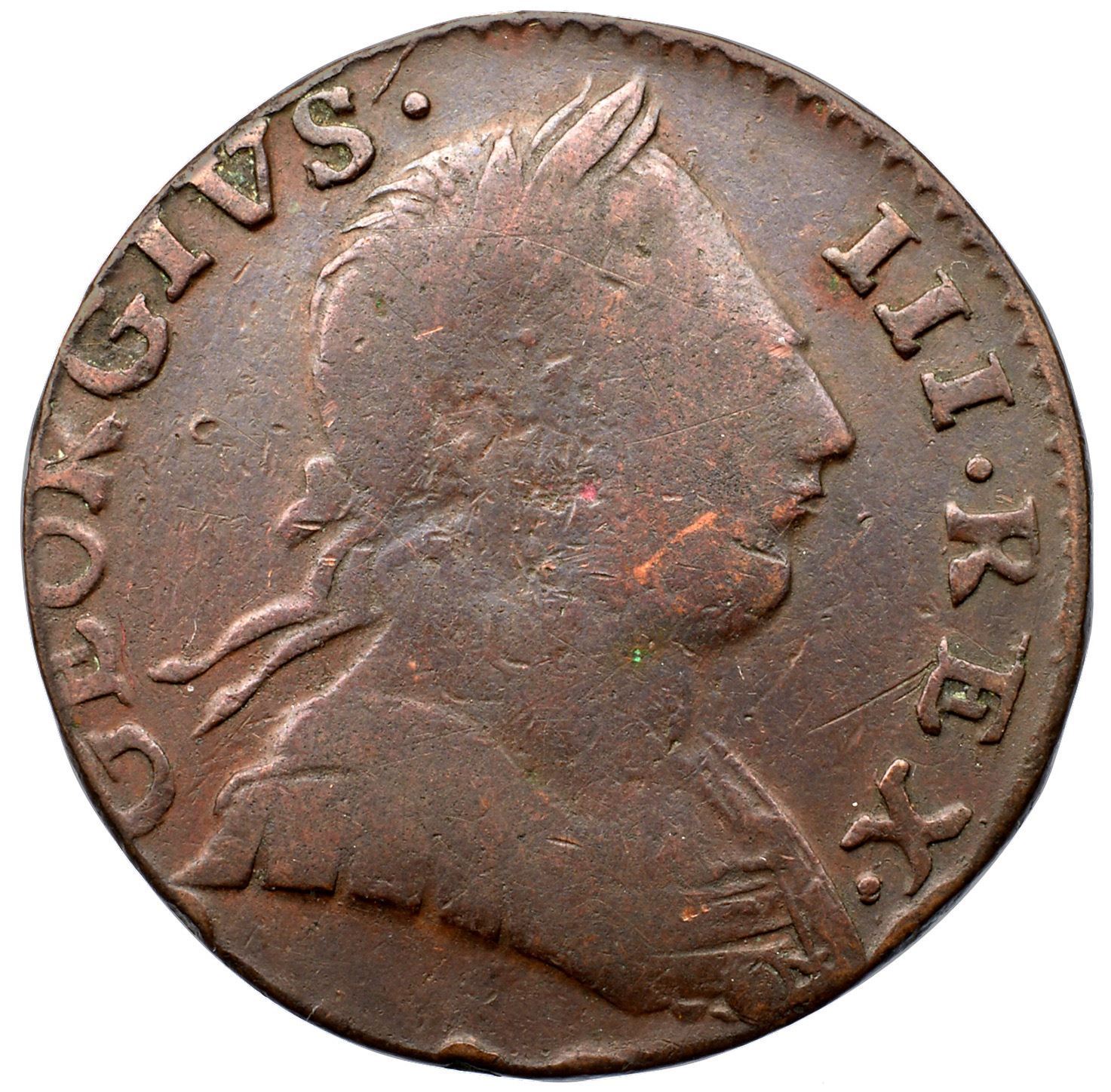 A Quintet of 1773-dated Counterfeit George III British Halfpence.All from different families, three of which have been published in the first volume of the book – all offered here unattributed, and this will make wonderful practice for the beginning collector. Included are: 1) Boyish George Family (116.4 grains), dark and rough Fine, fully attributable. 2) Aging George Family (119.4 grains), Very Good, lightly rough and with scratches, fully attributable. 3) Coin Y Family (126.8 grains), Fine, dark and very rough, especially the reverse, fully attributable. 4) Slanting Sevens Family (116.2 grains), Fine, a bit weak at centers, lovely surfaces, minimal marks; a family mentioned in the first counterfeit book, but not yet with varieties published. 5) Unknown family, not yet researched, showing an upside down A used for a V in GEORGIVS, 119.2 grains. Very Good, well-worn, but the legends full on either side, the upside-down A clearly showing the crossbar, and an exact match to the A punch used on the reverse; the date weak though both Neil and Tom Rinaldo, who he purchased this from, thought it was a 1775. A nice starter set showing some diversity of styles. Five coins in the lot.