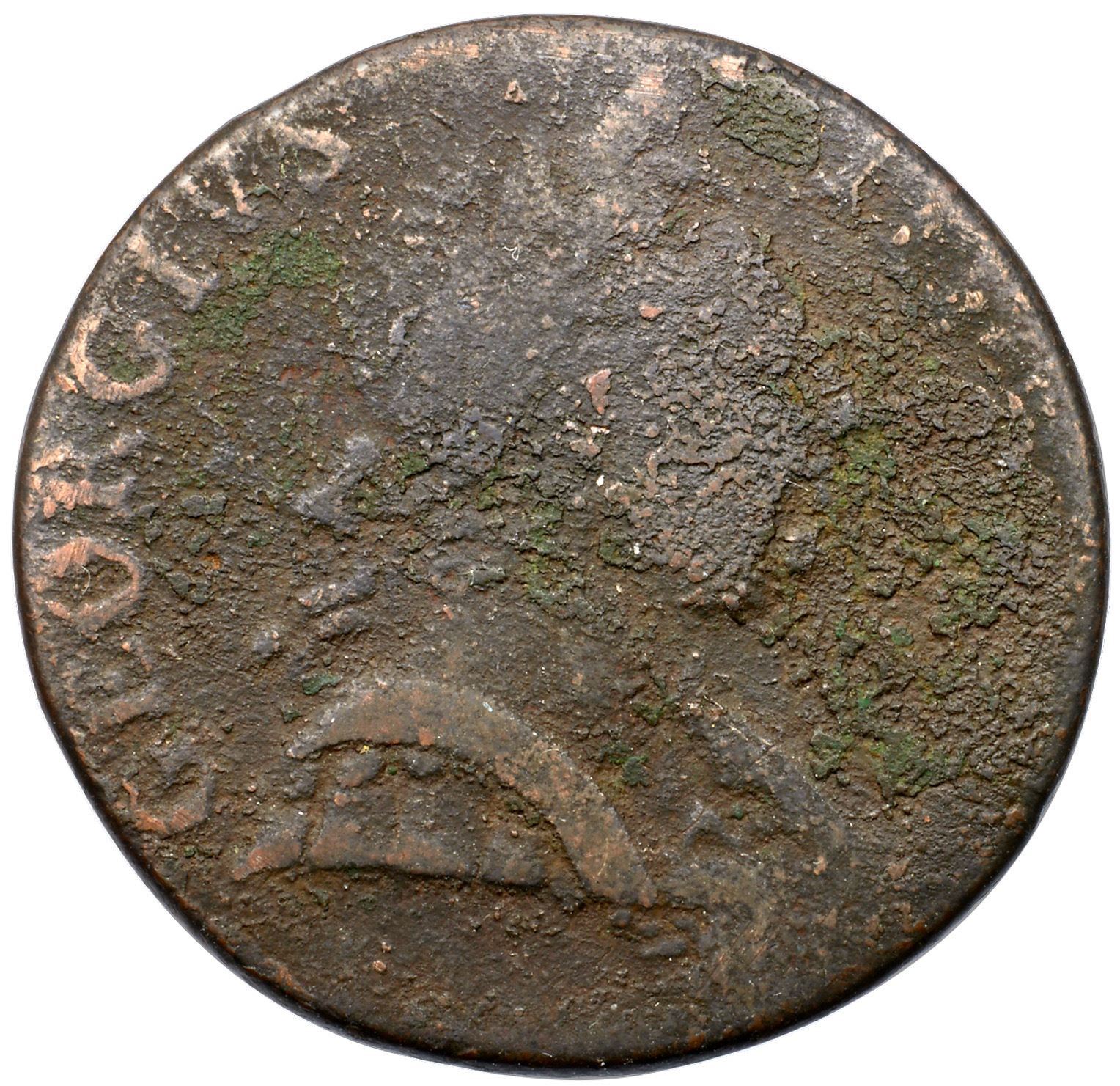 A Quintet of 1773-dated Counterfeit George III British Halfpence.All from unknown or unpublished families, which will require further research. Included are: 1) Rounded apple-cheek on king (132.0 grains), VF but lightly rough and with old scratches, intriguing type. 2) Young Head obverse (?) with a very atypical reverse with a very sloppy date (115.4 grains), Very Good, lighter color, some small flaws. 3) Pursed lips on bust (117.2 grains), Very Good, smooth, well-worn, striation at left reverse. 4) and 5) Very dark, evenly rough VG. (96.2 and 112.4 grains). Five coins in the lot.