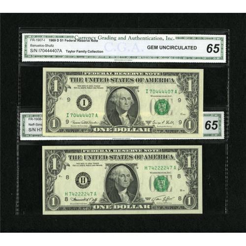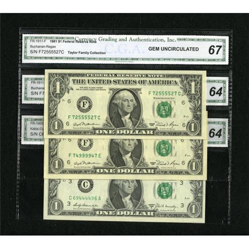 <B>A Quintet of Radars</B></I><BR> Five radars are noticed in this group, all with four digit matched middles. Series from the 60's to the 80's are seen. Notes range in grade from <B>CGA 64</B></I>, <B>65</B></I>, with one <B>Gem 67</B></I>.<BR><BR><b>Shipping:</b> Coins & Currency (<a target="_blank" href="http://www.heritageauctions.com/common/shipping.php">view shipping information</a>)