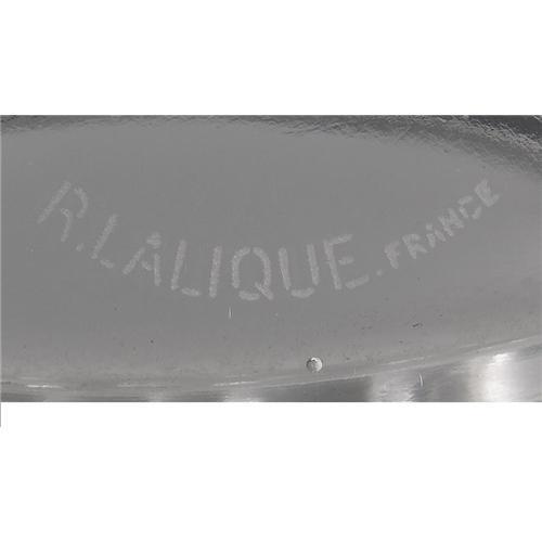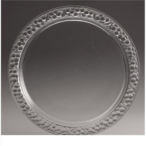 <B>A French Art Glass Tray</B></I><BR><BR>Rene Lalique, Paris, France<BR>Designed 1931<BR>Clear and frosted glass<BR>Marks: <I>R. LALIQUE, FRANCE</B></I><BR>14 in. diameter<BR><BR>In the 'Thomery' pattern (Marcilhac 3686) depicting a frosted relief band of scrolling vines and berries<BR><BR>Provenance: From the collection of Rita and Richard Chouinard.<BR> <BR><BR><B>Important noti