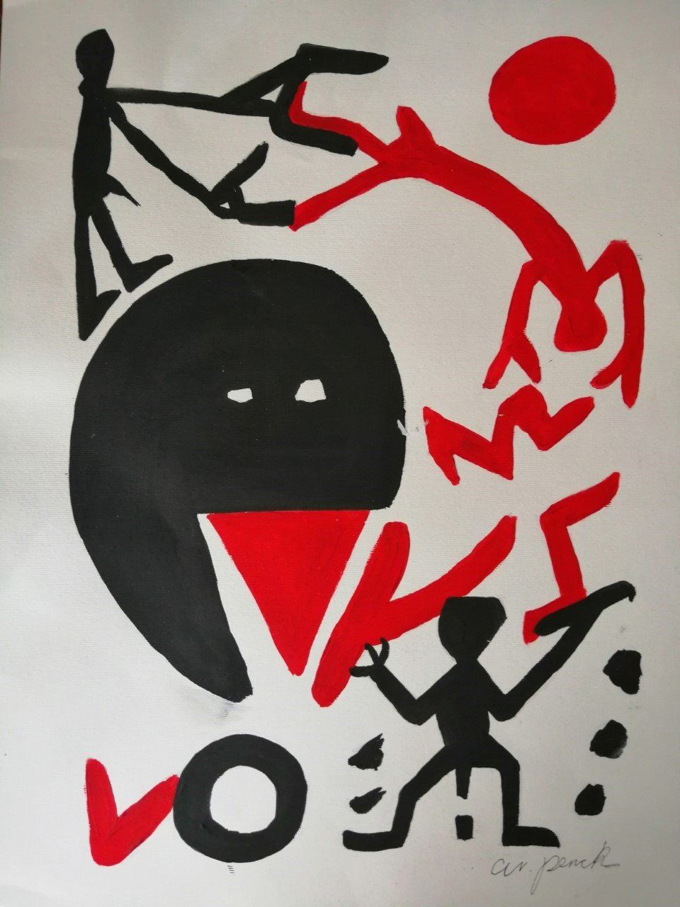 Painting 16x12 inches signed by A R Penck. Mounted and framed, and supplied with coa. For Penck, the stick figure, though a motif that dates back to cave art, represented the first ideogram of a proposed new system of communication that combined text, symbol and image. Standart was a conflation of the English word “standard” and the German Standarte, meaning “banner”. For the artist, these works operated like flags, emblematic of human universality. Penck’s interest in networks, and a prescient desire for the unhindered flow of ideas between individuals, also led to an interest in early computer technology.