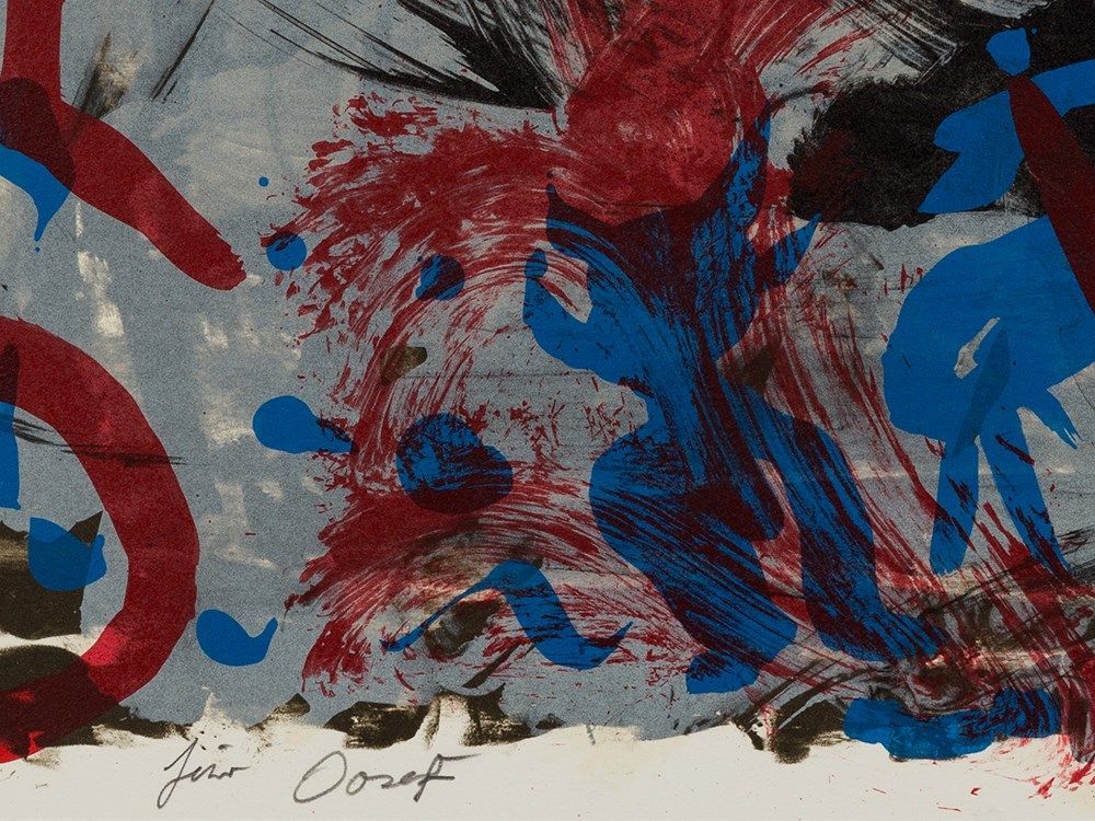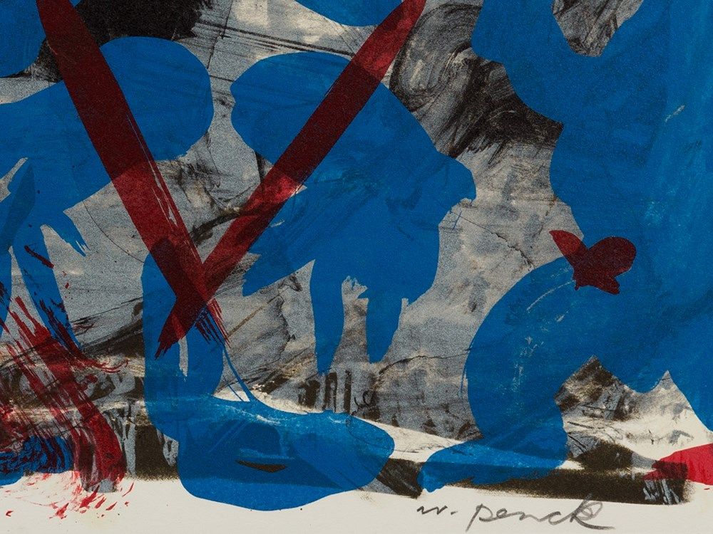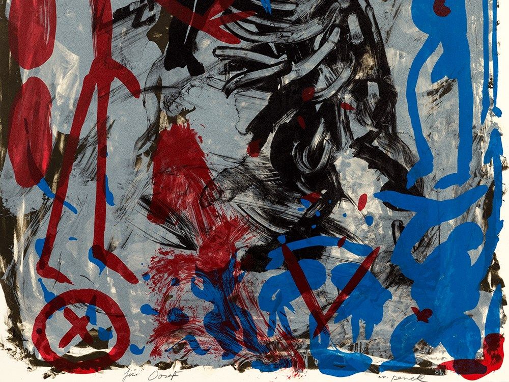 The lithograph in colors is signed lower right in pencil ‘ar. penck’ and dedicated lower left in pencil ‘für Josef’. The sheet is in very good condition. The full sheet image measures 80 x 60 cm.