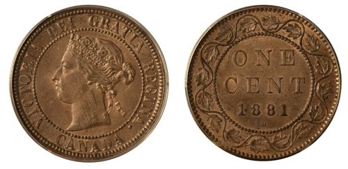 1881-H. CCCS graded Mint State-64, Red-Brown. Obverse port. #1. Multiple die clashes. (Charlton Page 308). 50% even red-orange luster. Housed in a hard plastic CCCS holder. Believed to be the highest graded example of this rare variety. Also, previously ICCS graded (BL 117).