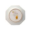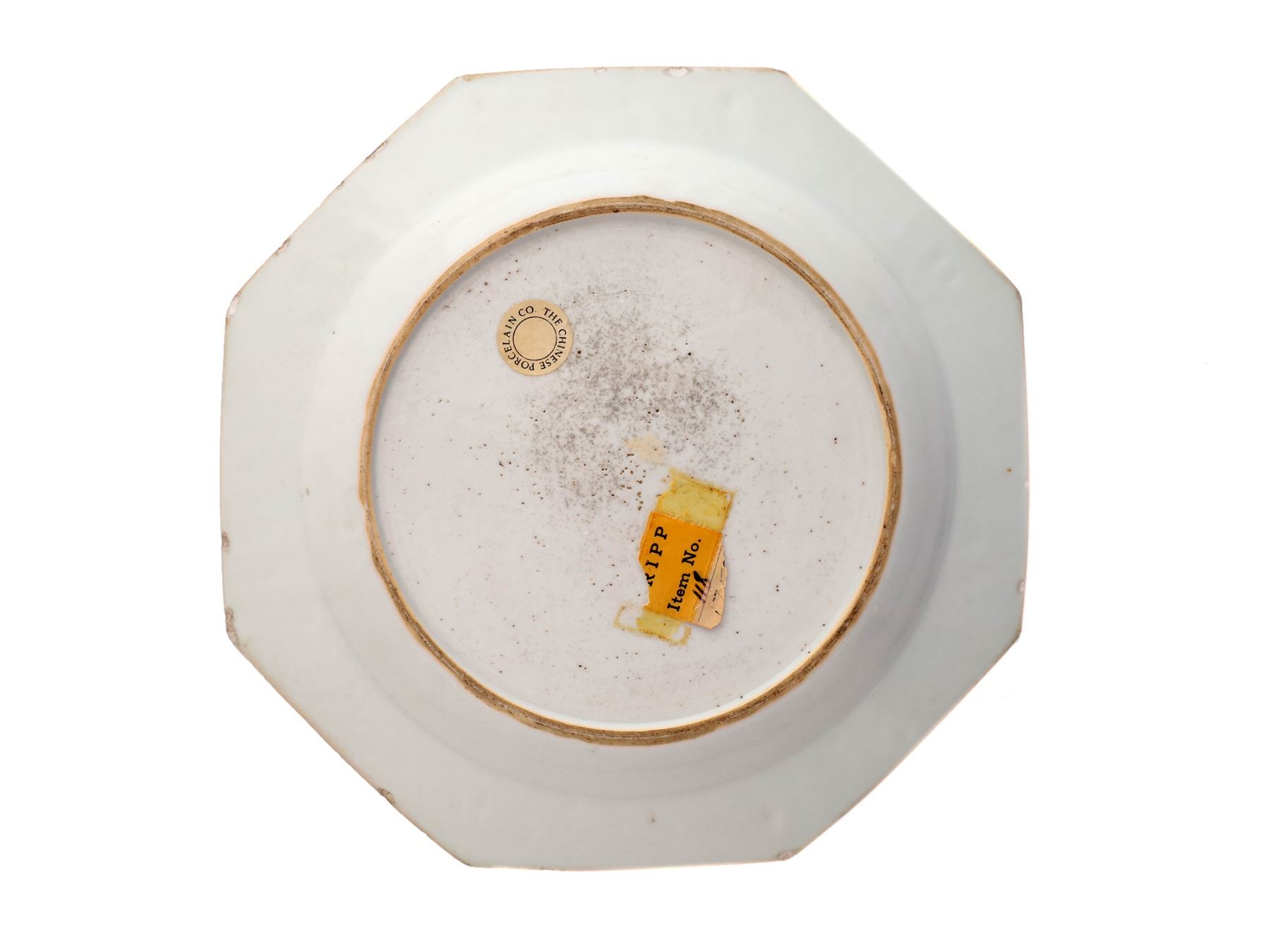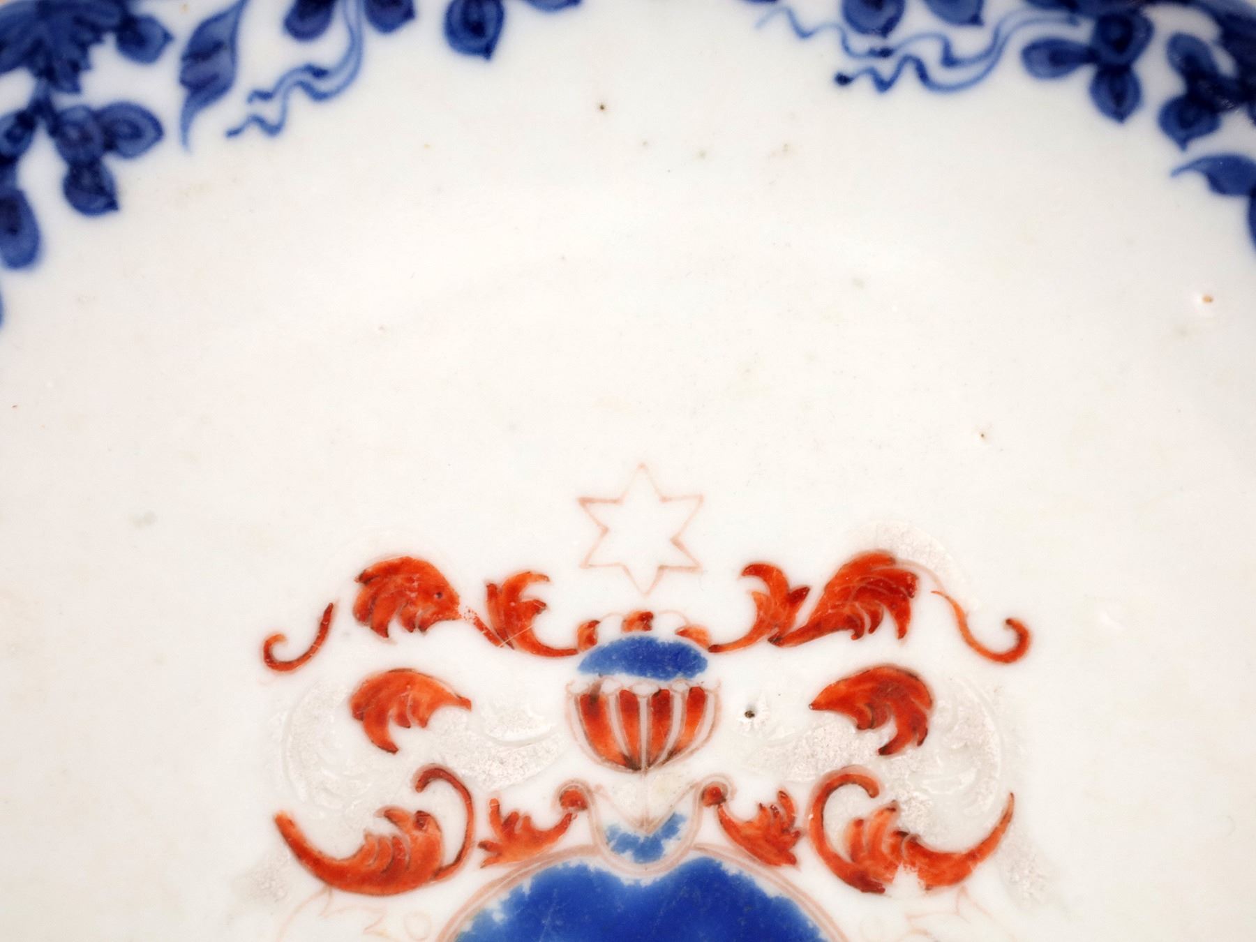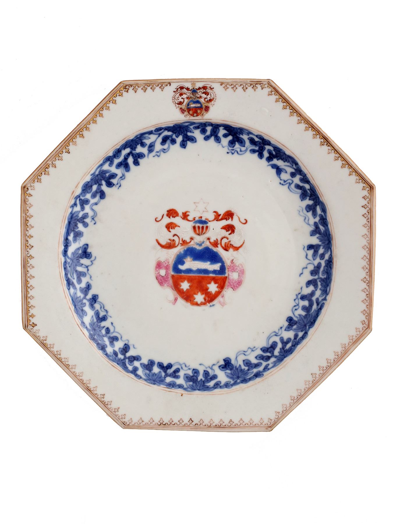 A Chinese export porcelain plate, of an octagonal form, with central decoration composed of a coat of arms with a round shield depicting a crowned dolphin on top and three six-pointed stars on the bottom part, surmounted by a knight's helmet with a six-pointed star. Surrounded by a beautiful cobalt-blue floral frieze. The border is decorated with the same coat of arms and has a decorative rim. The Chinese Porcelain Co. paper label is attached to the backside.