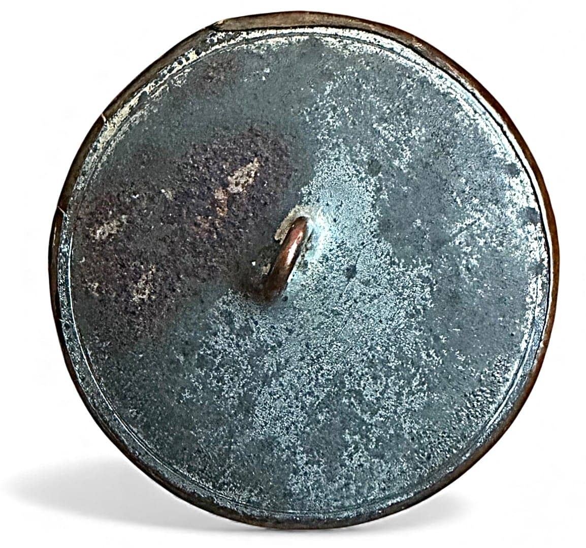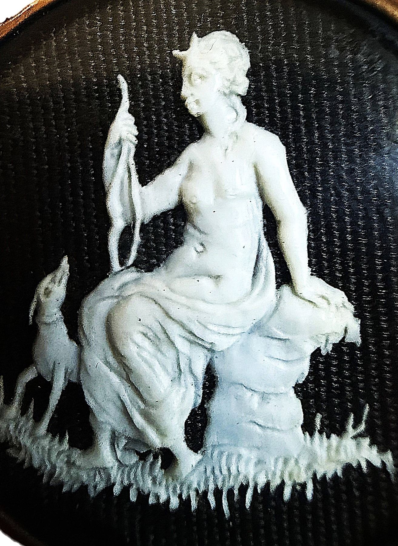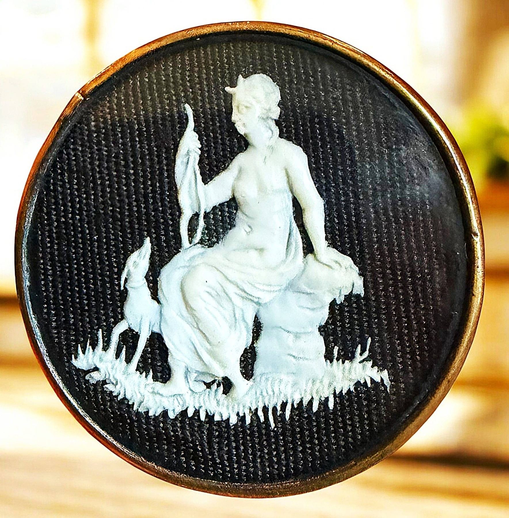 1 Large 18th century carved natural material under glass example. Dieppe carvings are attributed the Dieppe region of France where this style of carving on natural material was developed. The depiction of Diana and the hound is incredibly detailed and is set over a brown fabric background and placed under glass. Often these backgrounds have faded over time but this example is in excellent unfaded condition. Set with a copper rim and tin back typical of the 18th century. This fine and scarce example is not one to pass up. The depiction and fine detail the artist was able to attain in this carving is truly remarkable and more outstanding than any photograph can obtain. The buyer of this button will most assuredly cherish it forever.