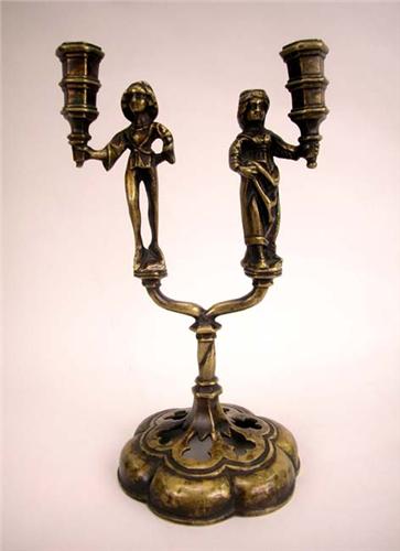 A RARE BRONZE CANDELABRUM, GERMAN, WITH MALE AND FEMALE FIGURES HOLDING CANDLE CUPS