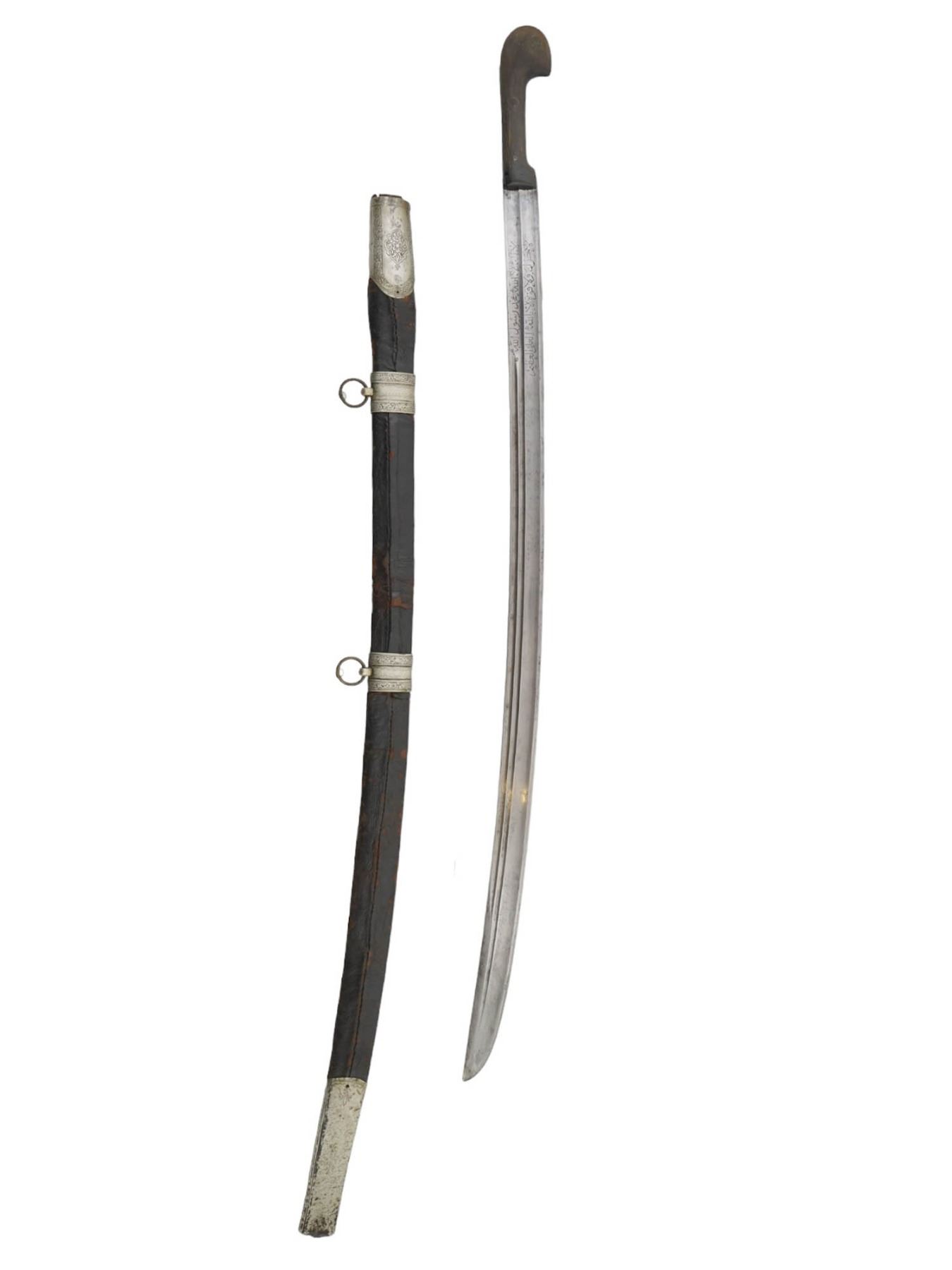 A rare shashka with a light curved fullered blade decorated with Arabic inscriptions, original wooden scabbard covered in black stitched leather, featuring low-grade silver mounts.