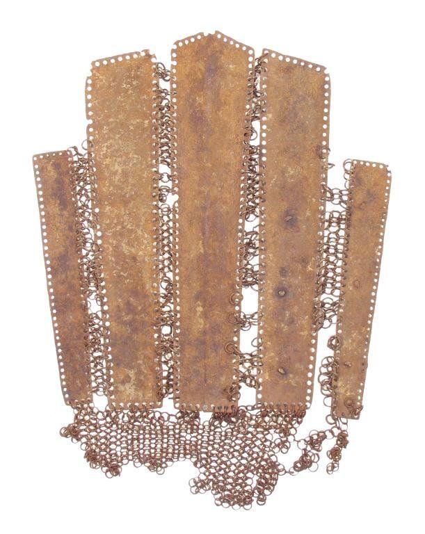 Of splinted type, composed of five rectangular plates, the longest with raised central ridge, each connected by bands of riveted mail terminating in a gauntlet.With buckles intact.Mid-16th century.Substantial losses to mail.Overall length 40.2 cm. Condition III