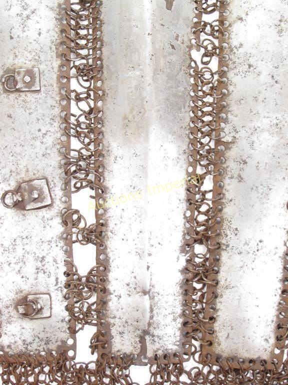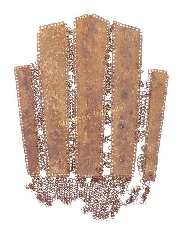 Of splinted type, composed of five rectangular plates, the longest with raised central ridge, each connected by bands of riveted mail terminating in a gauntlet. With buckles intact. Mid-16th century. Substantial losses to mail. Overall length 40.2 cm.