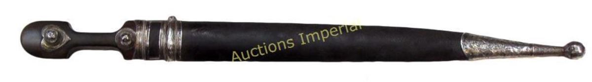 The grips of horn, with silver mounts engraved, nielloed and parcel gilt in characteristic Circassian motifs, the blade long, straight and double-edged with high central ridge and rare talismanic circular cartouche with stars at the forte on either side. In its leather-covered wooden scabbard with silver mounts embellished en suite with the hilt, signed on the locket, HADJI ABRDASHI (?) Early 19th century. Minor wear, hairline crack across reverse grip. Overall length 54 cm.