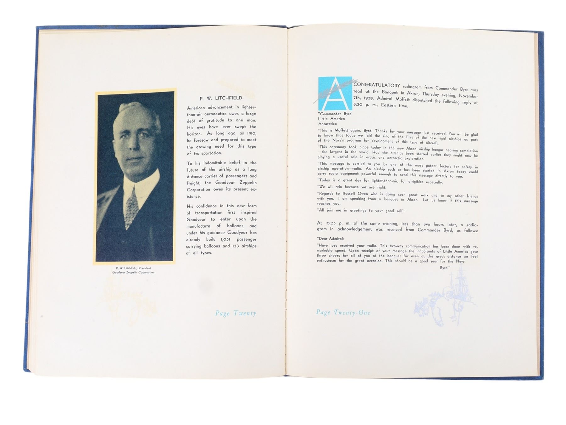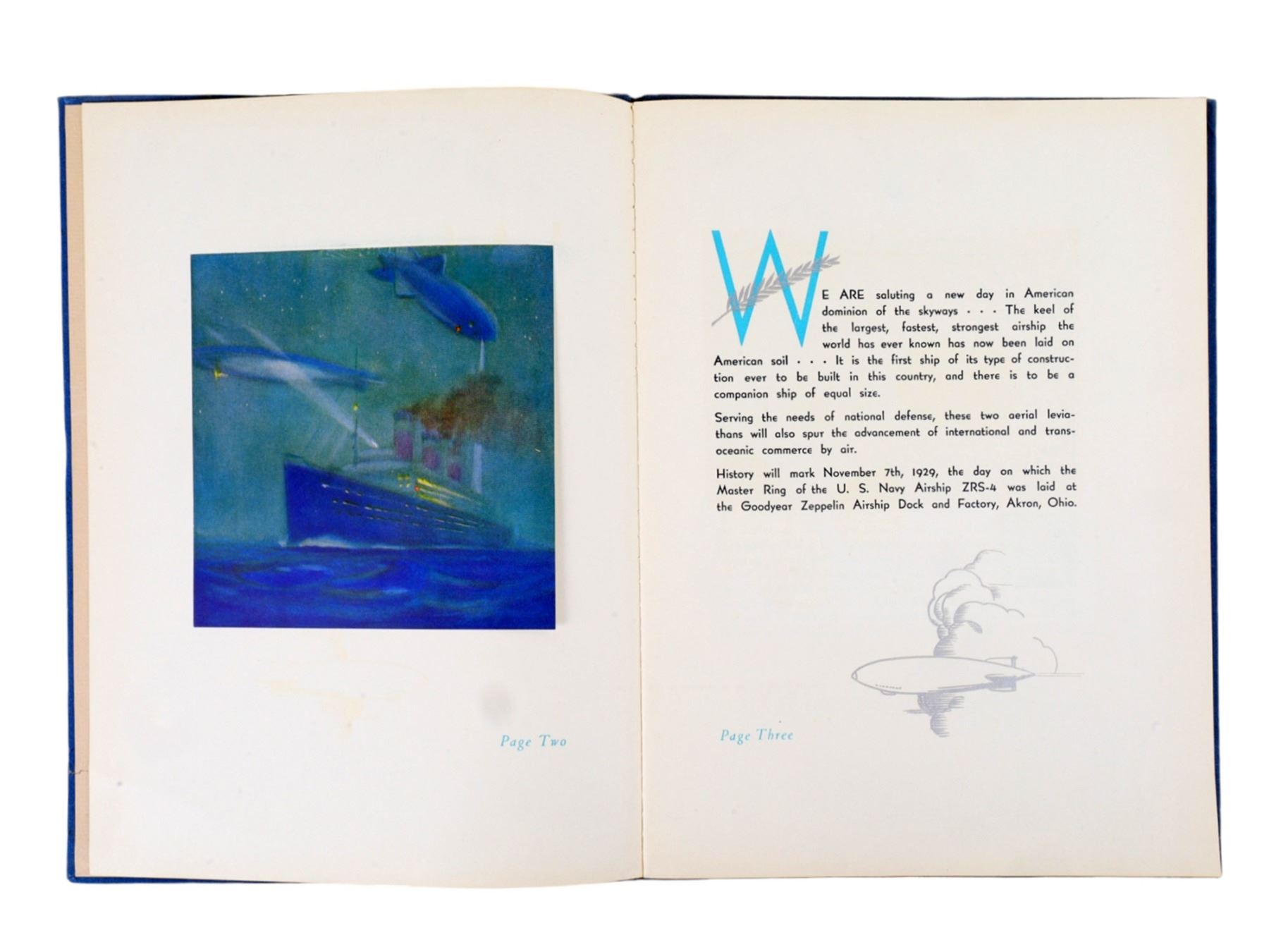 A very rare book commemorating the Master Ring Laying ceremony of the ZRS-4 Zeppelin at the newly built 'Goodyear Zeppelin Airship Factory and Dock', at the time the largest single-span building in the world, in Akron, Ohio on November 7th, 1929. This ship was the first ever purpose-built flying aircraft carrier and would serve the U.S. Navy for just under two years before perishing along with 73 of her 76 crewmen and passengers in a thunderstorm off the coast of New Jersey in 1933.