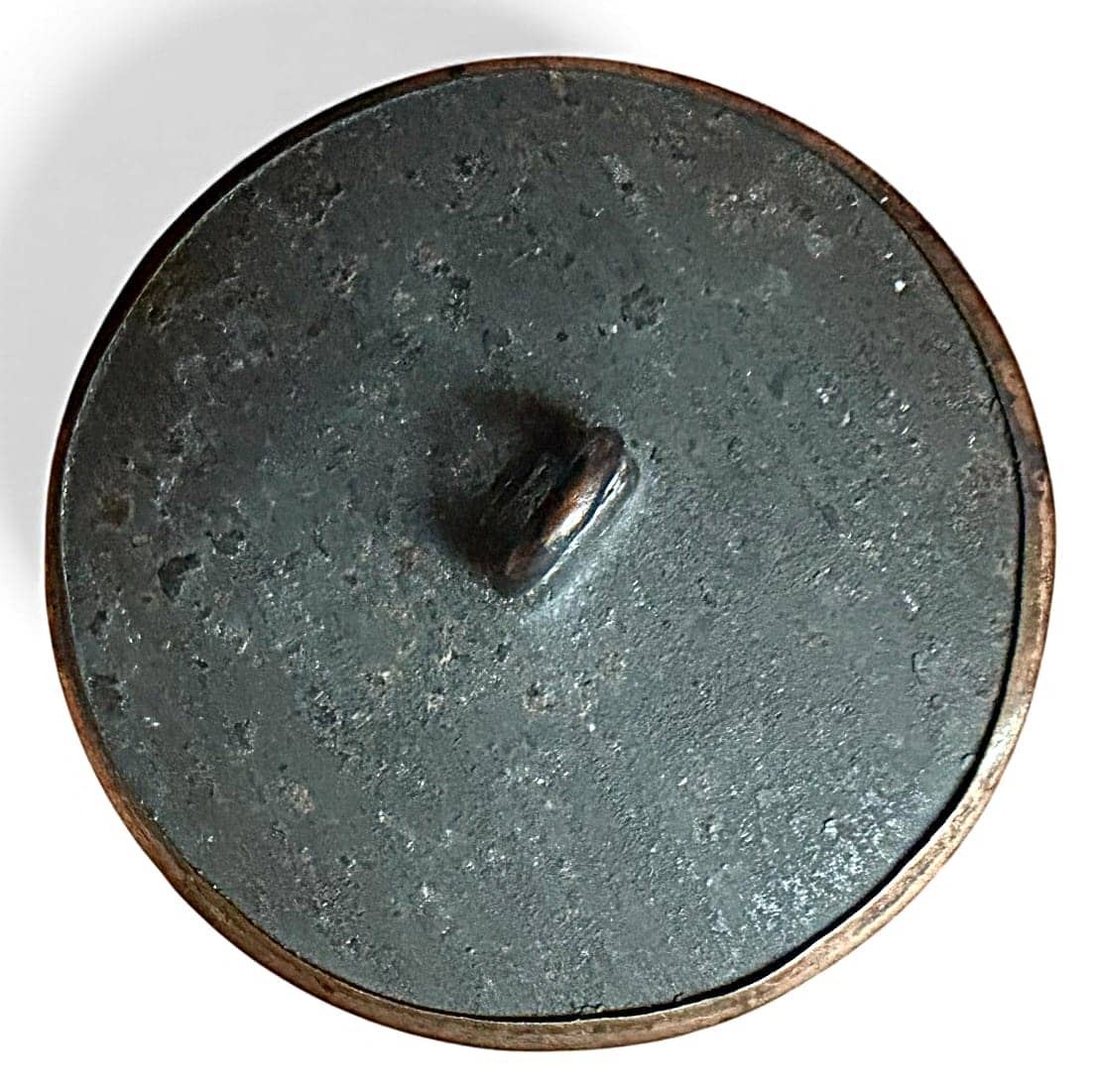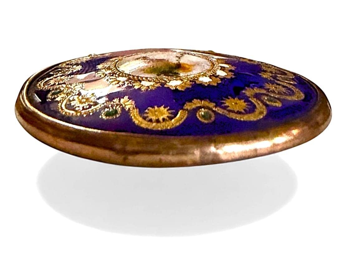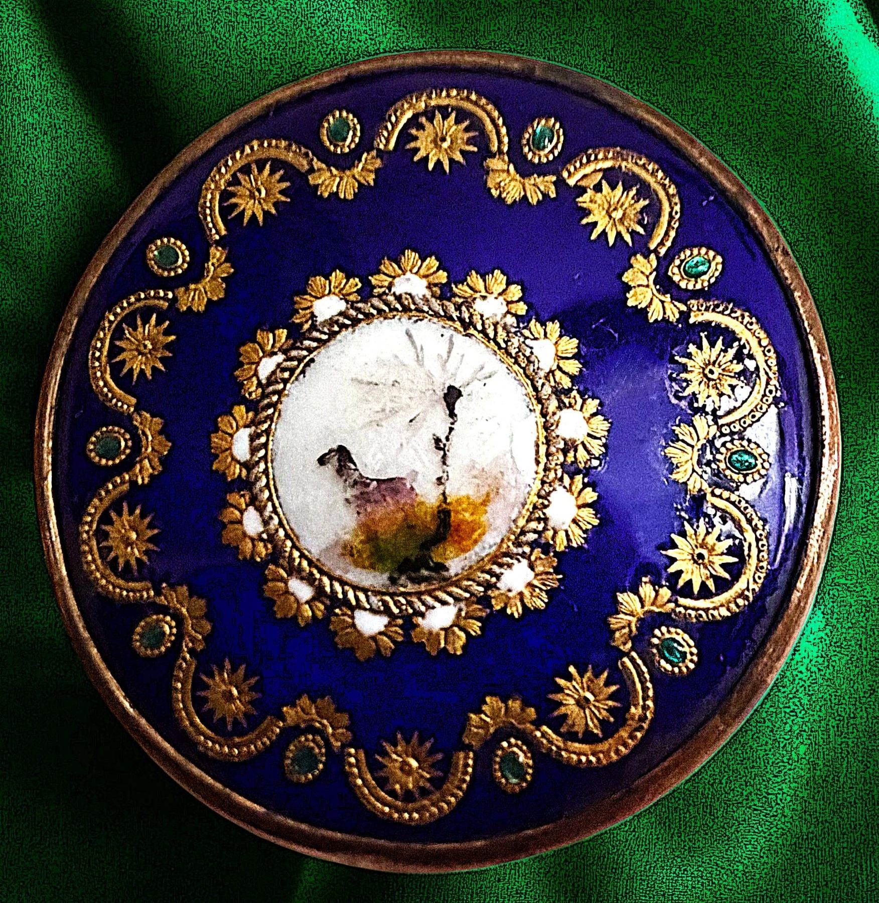 1 Large 18th C. cobalt blue enamel with gold foil paillons & more. Here is an exquisite and hard to find example of fine enamel craftsmanship from the 18th century. The enamel is set with a copper rim and tin back typical of the time period. The base cobalt enamel is enhanced with gold foil paillons and green pierriries framing an inner border or gold paillons and white pierriries which farther frames a hand painted and white enamel design center. A great and wonderful example of 18th century multi technique work.