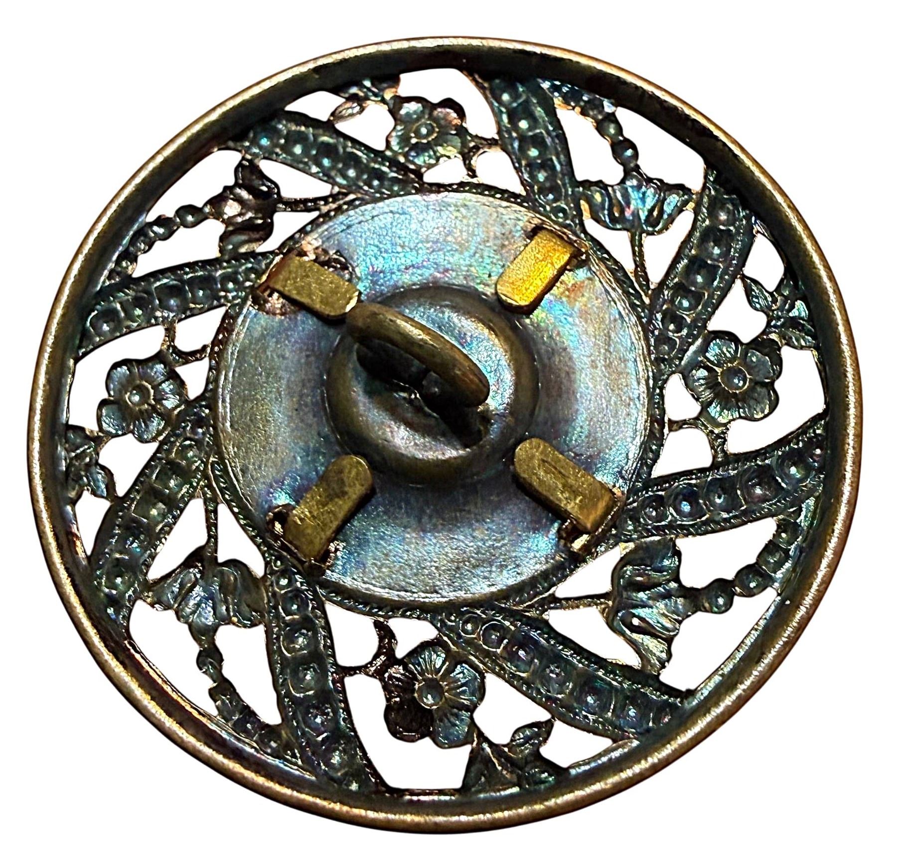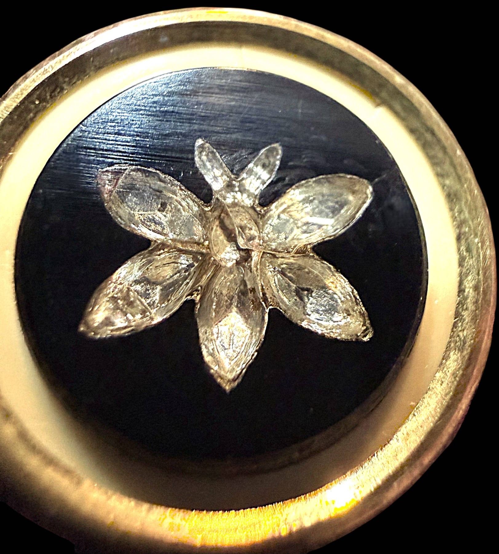 1 Large pierced 19th century Victorian celluloid example. Bruce told us he was blown away to fInd this button on a card from the collection of Nikki Deal. I had never seen this button before now and was delighted it find it. The pierced brass is centered with a Victorian Ivoroid center in which a black glass precision inlay is set depicting a brilliant butterfly. Unusual and beautiful example.
