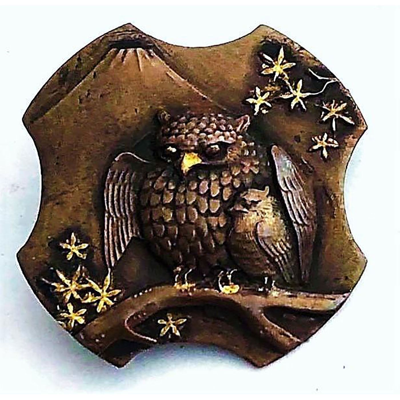 1 Medium size unusual shape fabulous Shakudo metal owl button. This is an incredible Japanese metal works "Shakudo" button. The shape is one of the most unusual shapes I have ever seen and the owl is a beautifully detailed owl set on a branch showing Mt. Fuji in the background. Wonderful gold accents and patina. Beautiful!!!