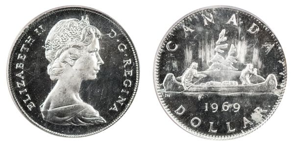 NICKEL DOLLAR. 1969. Struck on a silver Fifty Cents planchet. PCGS graded Proof-Like-65. Deep mirror fields and a Heavy Cameo bust. A spectacular error.