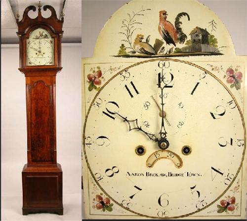 A RARE FEDERAL APPLEWOOD TALL CASE CLOCK; Aaron Brokaw, Bridgetown, New Jersey, the swan's neck pediment above a white painted dial within colonettes, the waisted case below with arched door and quarter-columns on a paneled base and bracket feet, feet restored, 7'11"h Illustrated, Drost, William E., Clocks and Watches of New Jersey, pg. 17-19