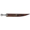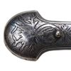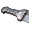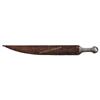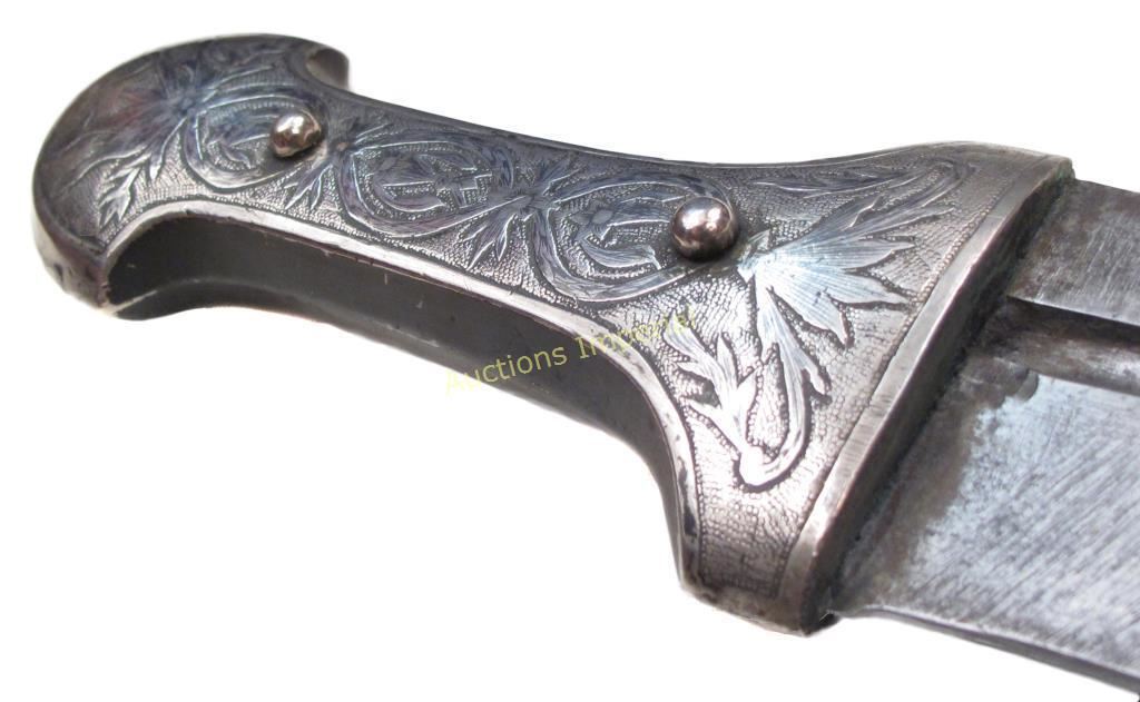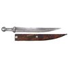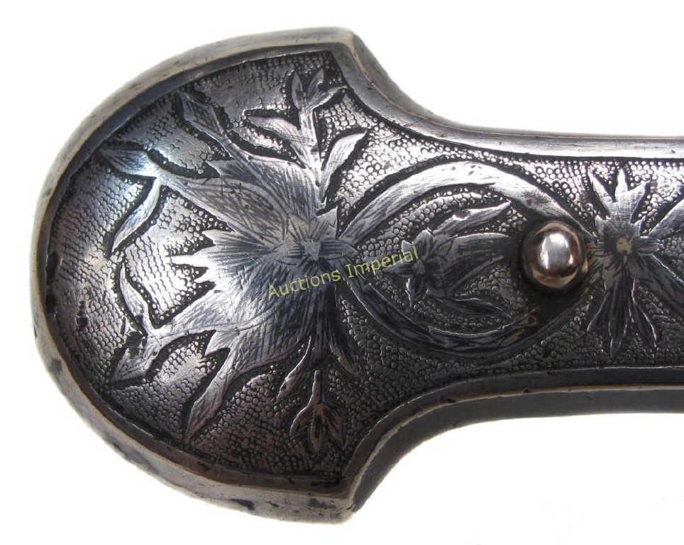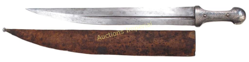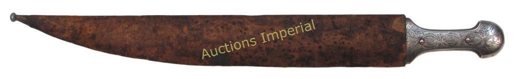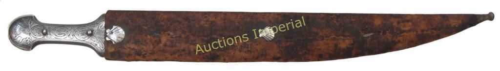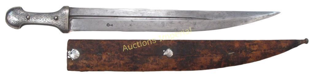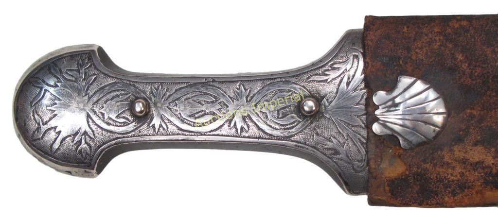 A massive example, the solid silver hilt showing Epirus workmanship, engraved and nielloed overall with garlands and stands of arms on each side. The heavy heirloom double-edged Caucasian blade likely captured from the Ottomans, with central fuller and struck Arabic maker’s mark to either side. In its leather-covered scabbard with applied silver scallop shells, a symbol of baptism in the Greek Orthodox Church. Beginning of the 19th century. Light wear. Overall length 66.2 cm.