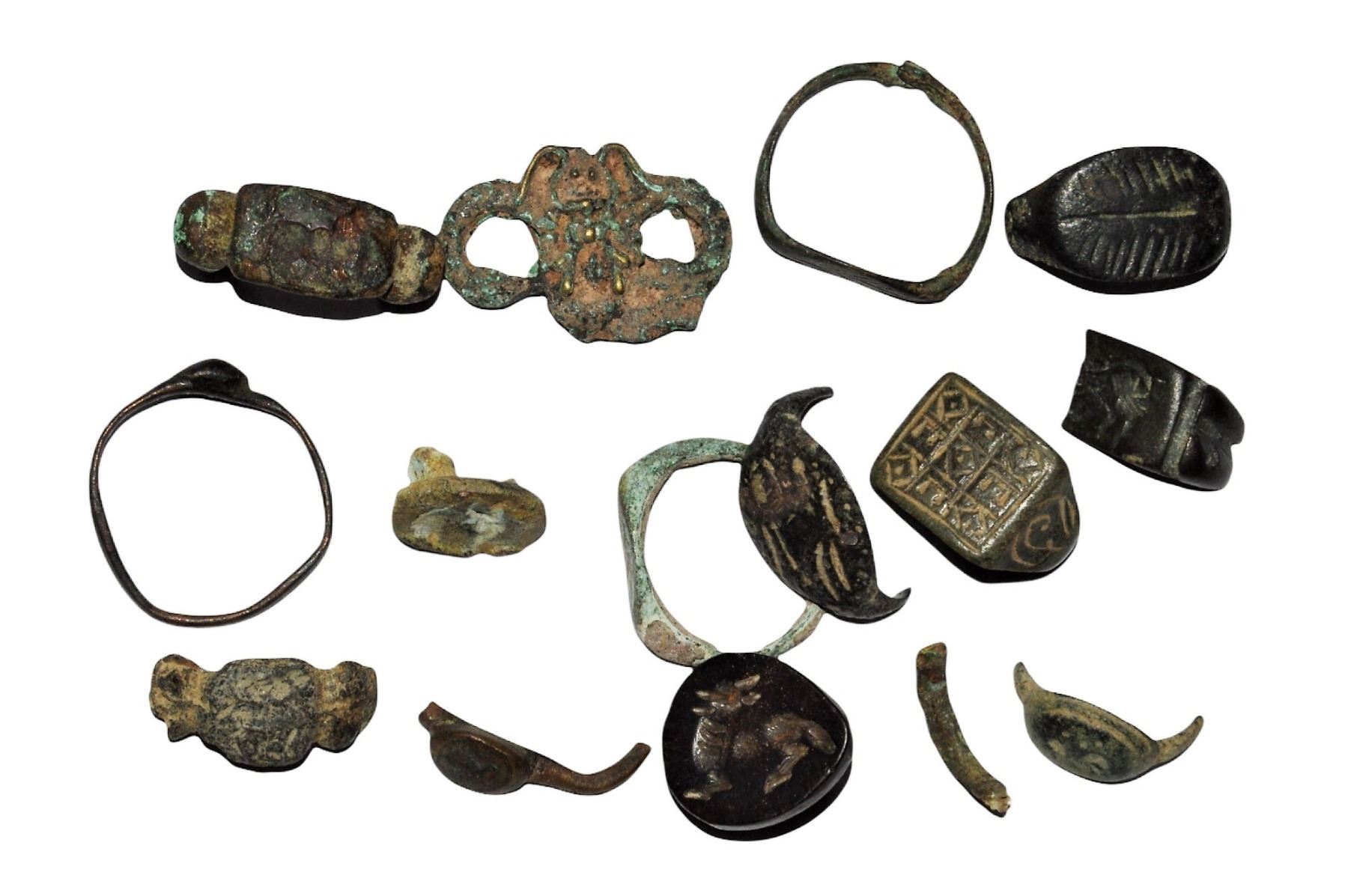 A RARE GROUP OF ANCIENT BRONZE RINGS SEALS & INTAGLIOS, HELLENISTIC GREEK CARNELIAN BLADE, POSSIBLY 3RD-1ST CENTURY BC.