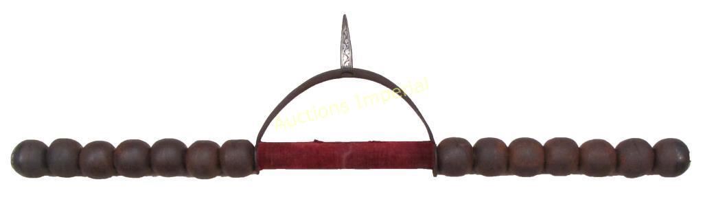 Wrought entirely of steel with panels of heavy inlay, comprising seven spheres on each side of the cylindrical grip, protected by a semicircular guard from which springs a quadrangular thrusting blade. Beginning of the 19th century. Light wear to silverwork. Overall length 43 cm.