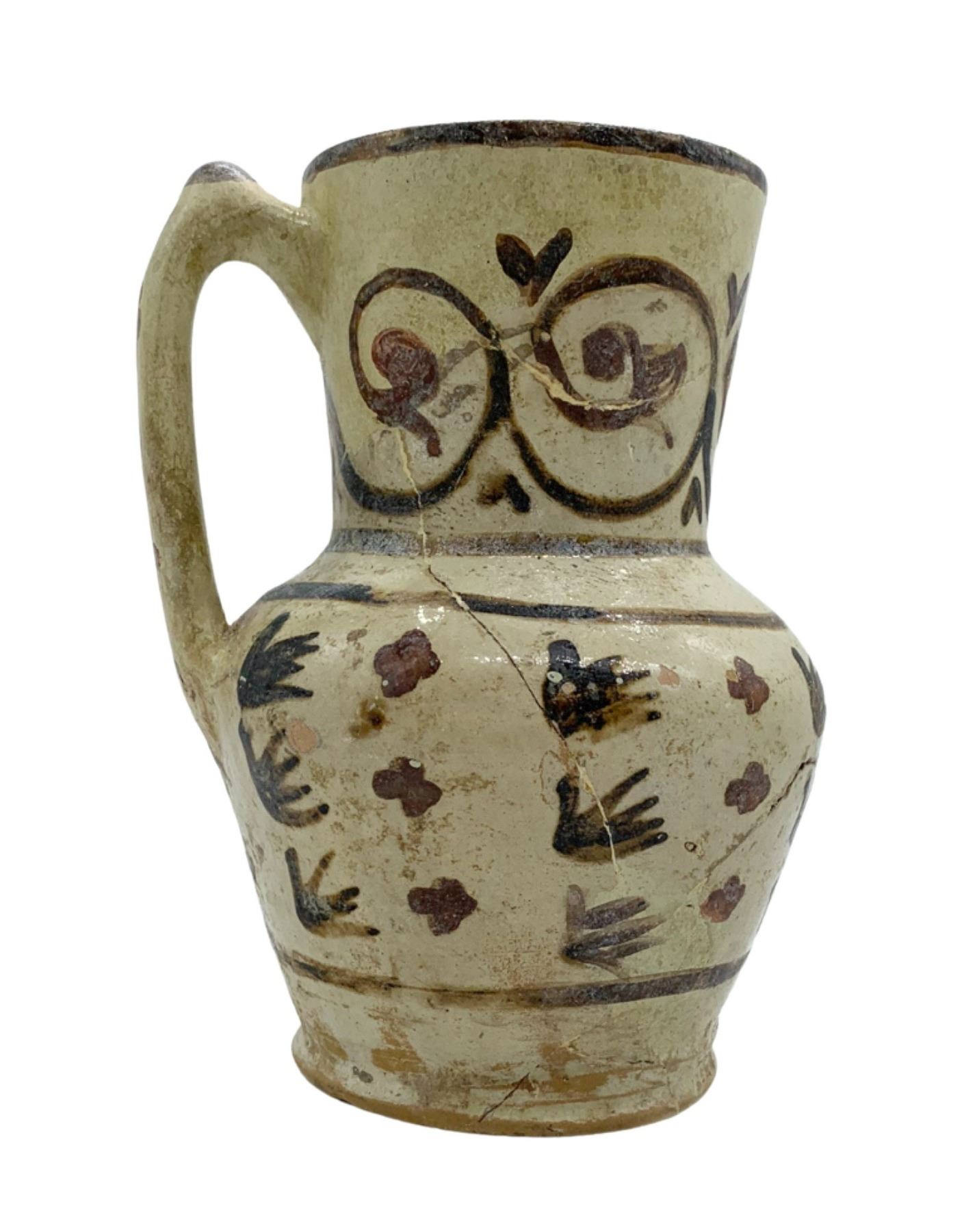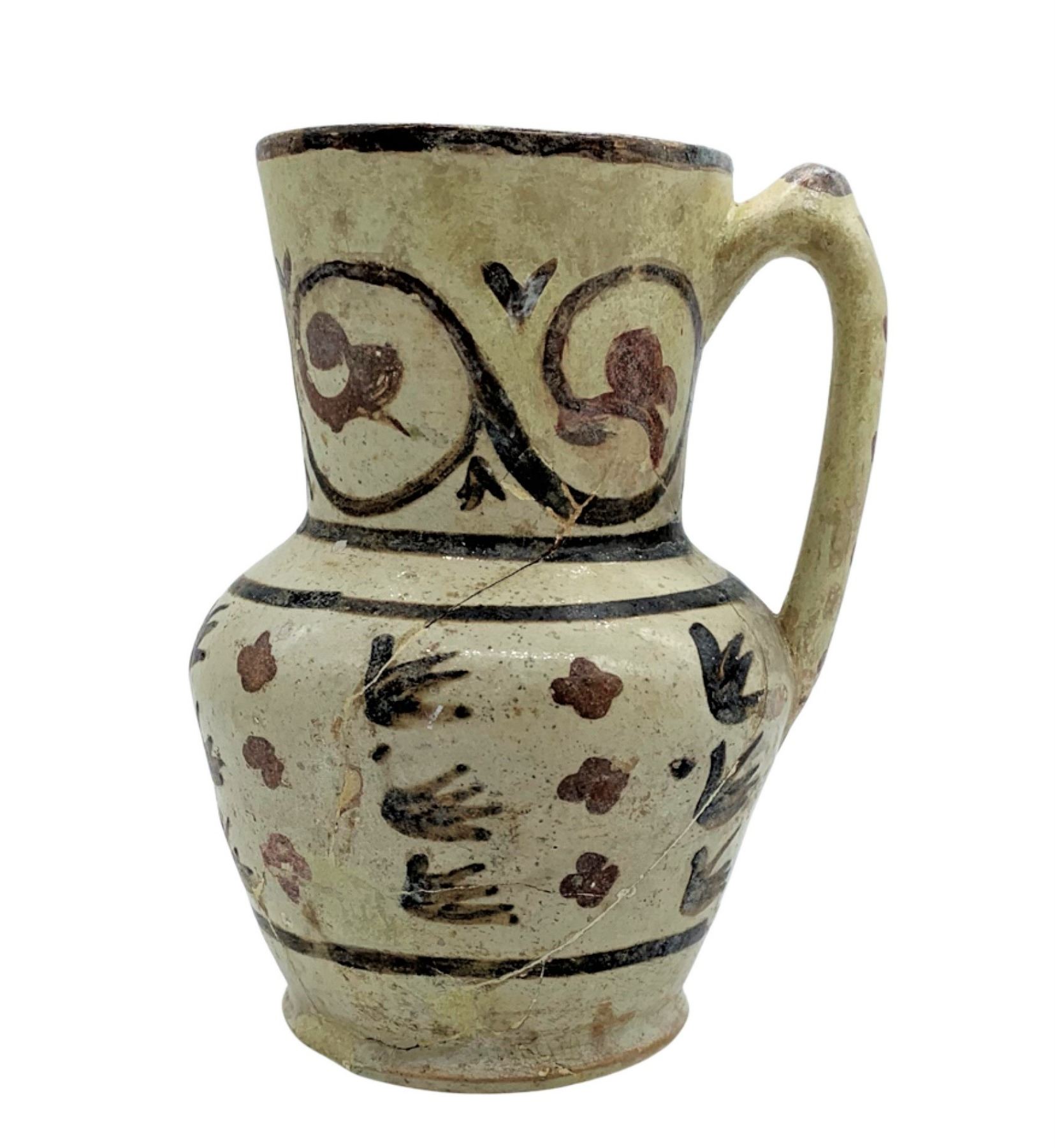 A RARE & UNSUAL ANCIENT ISLAMIC SAMANID POTTERY JUG, SAMARKAND CENTRAL ASIA CIRCA 10TH/11TH CENTURY, Decorated with flowers & vegetal motifs in Black & Red Colors, Probably Late Abbasid to Early Samanid , Very Interesting & Rare Piece. These types always comes with calligraphy in black or red color but this rare piece has only designs and no calligraphy.