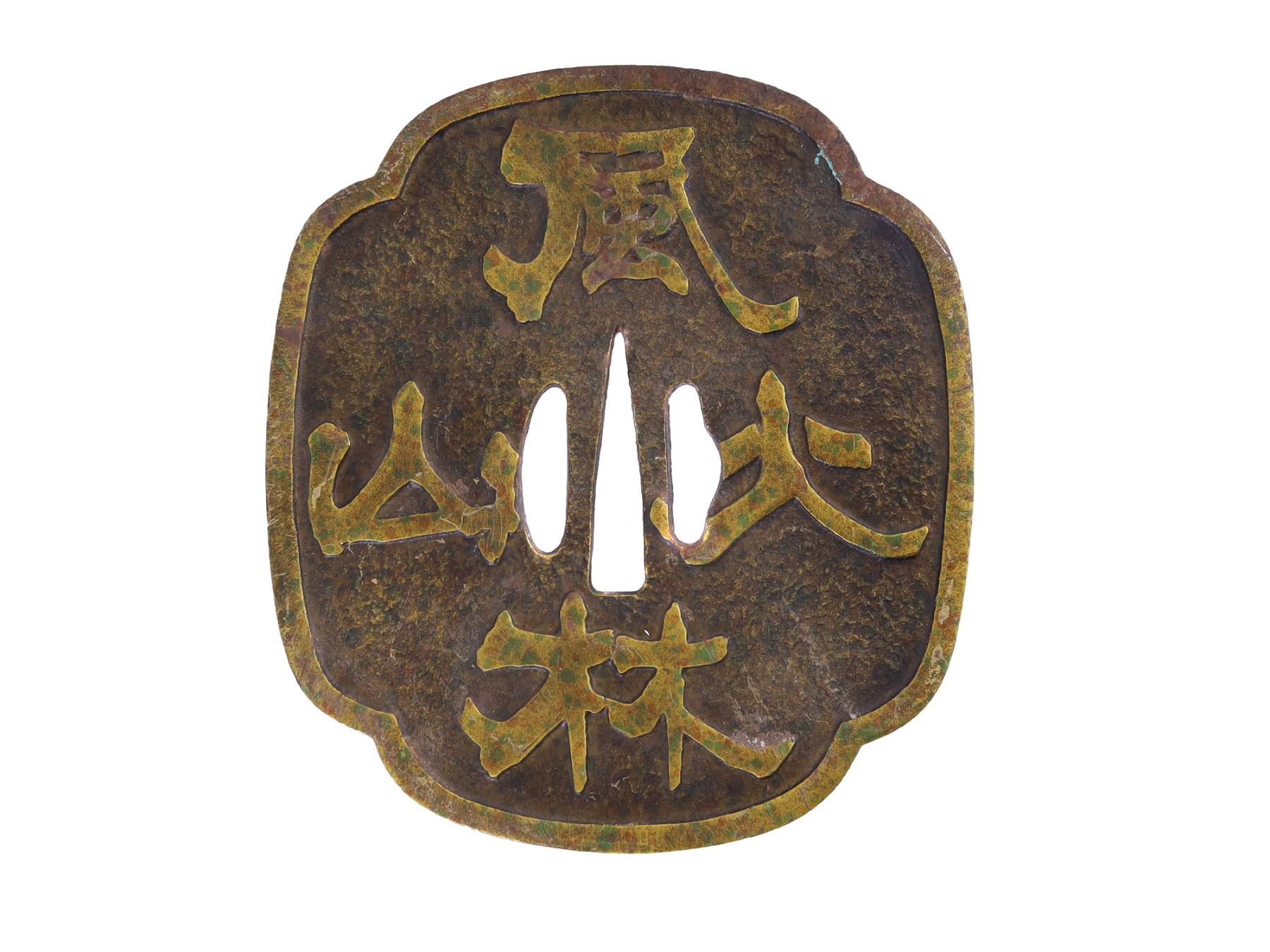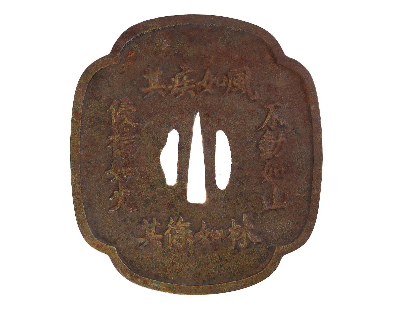 The backside of the tsuba explains the coherence between the elements and the sword. The sentence 其疾如風 on the top may be translated as "it is fast like the wind", and the sentence on the bottom 其徐如林 "it is steady like a forest". The left one 侵掠如火 "Furious like a fire" and the right one 不動如山 "immovable like a mountain".