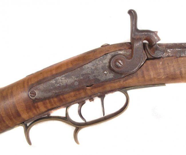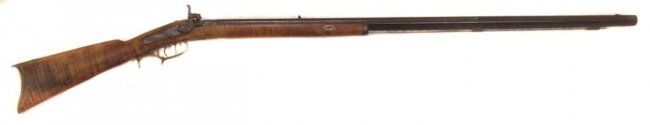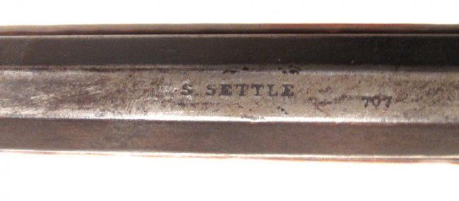 Halfstocked in actively-grained wood, with brass furniture and backaction percussion lock. The rifled, octagonal barrel marked by the maker, S SETTLE and numbered 707. Made by Simon Settle (1823-1871) of Barren County, Kentucky. The Settles established themselves as gunsmiths in Kentucky in 1800, their rifles were highly prized. Simon Settle is considered the foremost maker of the family. Mid-19th century. Light wear. Overall length 142.9 cm.