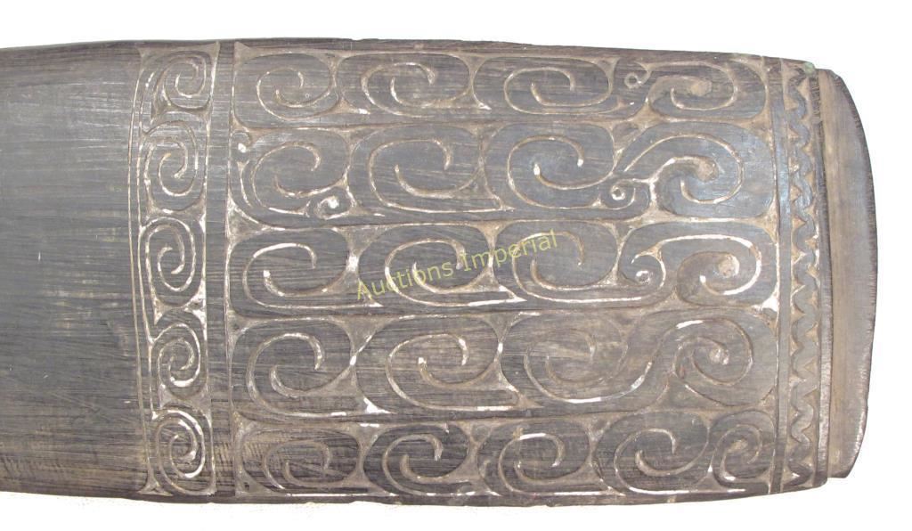 Well-carved of a single section of hard, dark wood, with expanded guard and ogival pommel. The blade flattened and expanded toward the tip, carved in characteristic scrolling motifs with remains of lime inlay. Good patina. Late 19th- early 20th century. Remains of collection tag affixed. Overall length 58.3 cm.