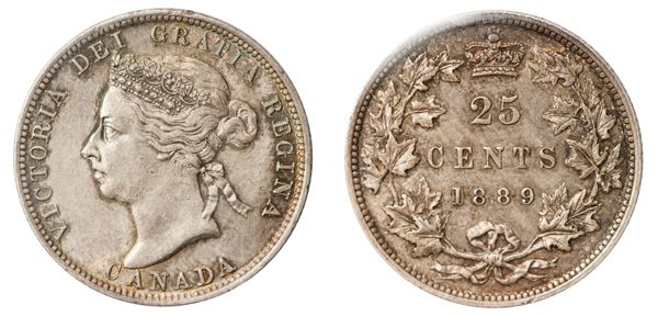 1889. ICCS Mint State-62. Medium heavy, amber toning over very clean fields and surfaces. A rare mint state example of one of the ‘keys’ of the Victorian twenty-five cents series. Ex. Belzberg Sale..