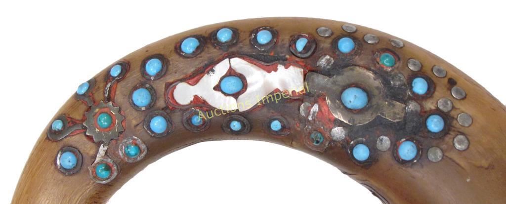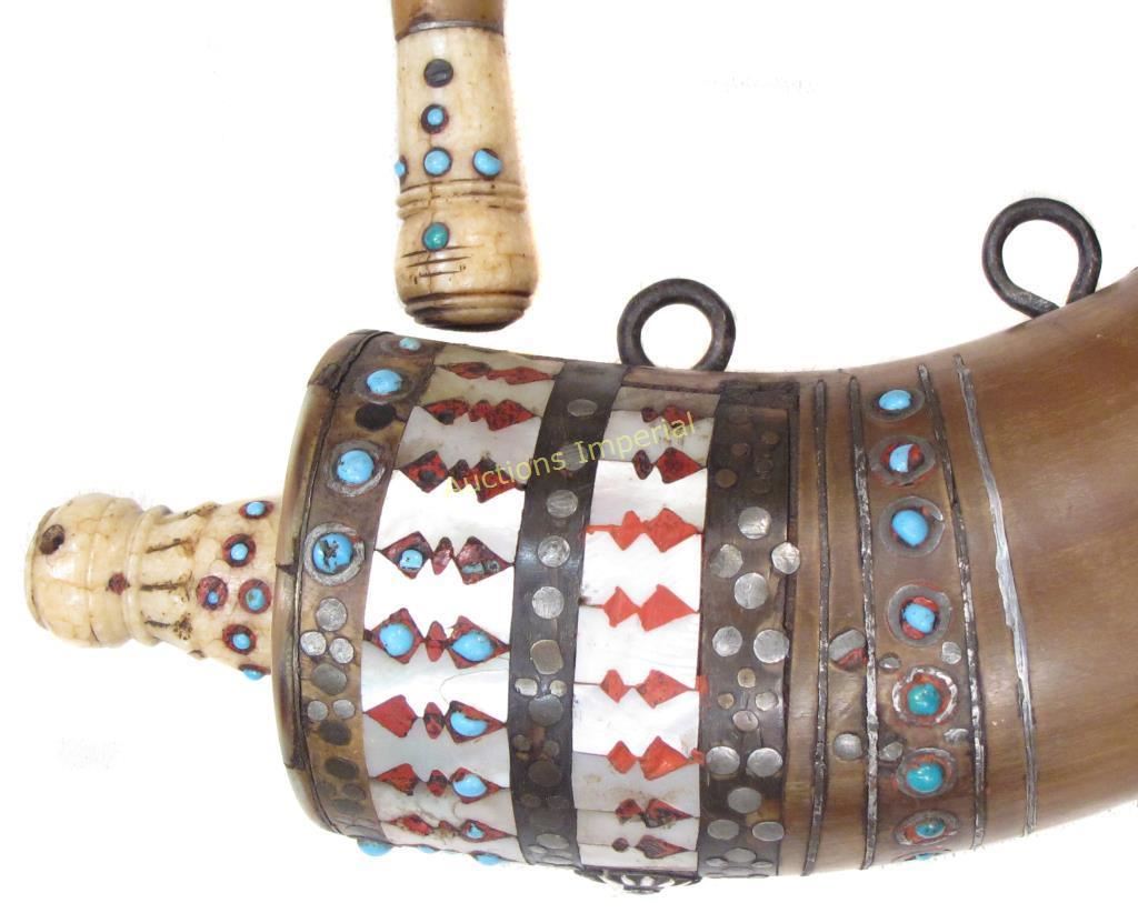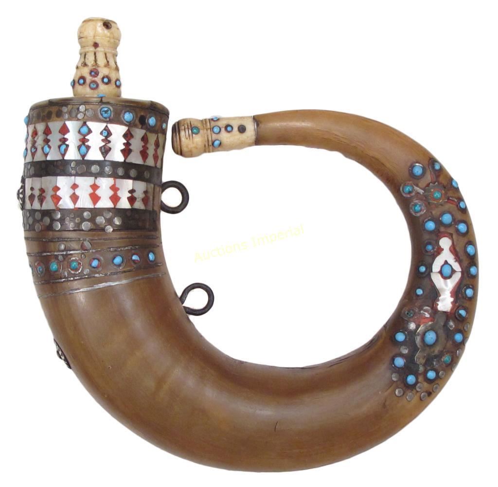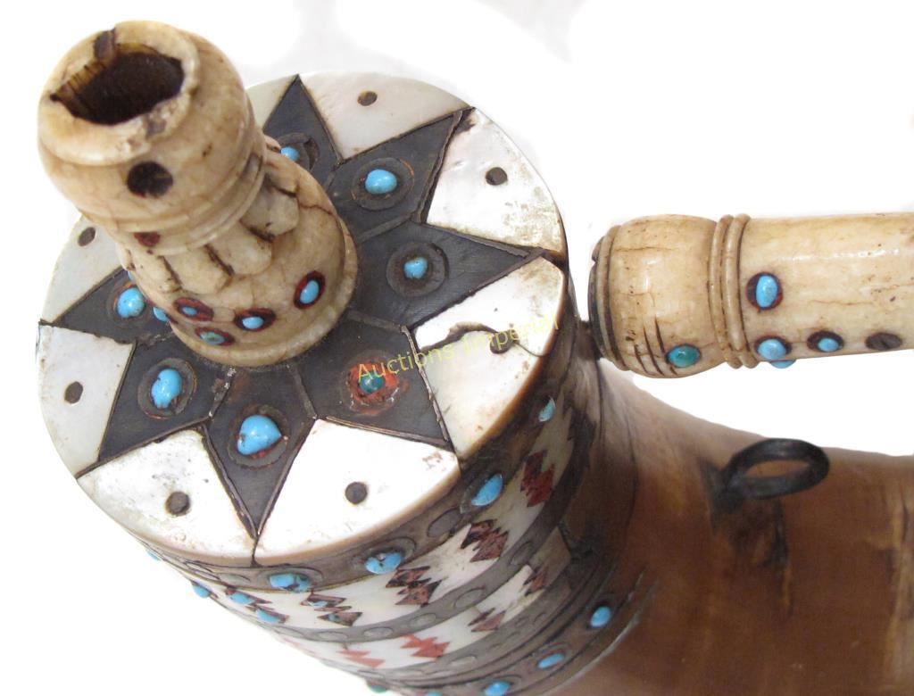 Of amber-colored translucent horn with carved walrus spout and terminal, elaborately inlaid with mother of pearl panels, turquoises and studs and in geometrical patterns together with line-inlay. Mid 18th century. Light wear. Overall length 22.6 cm.