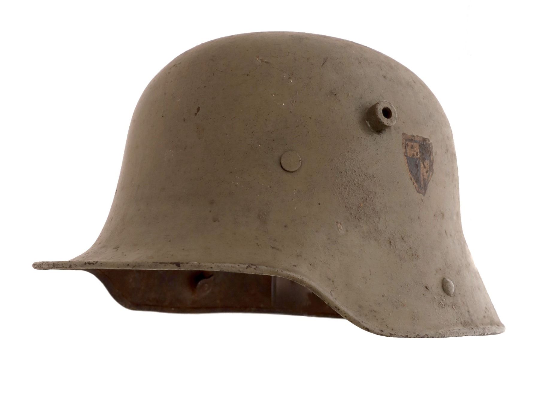 An original Prussian Garde helmet with black-white Prussian shield insignia on the side for an elite troop.  Period paint.