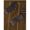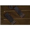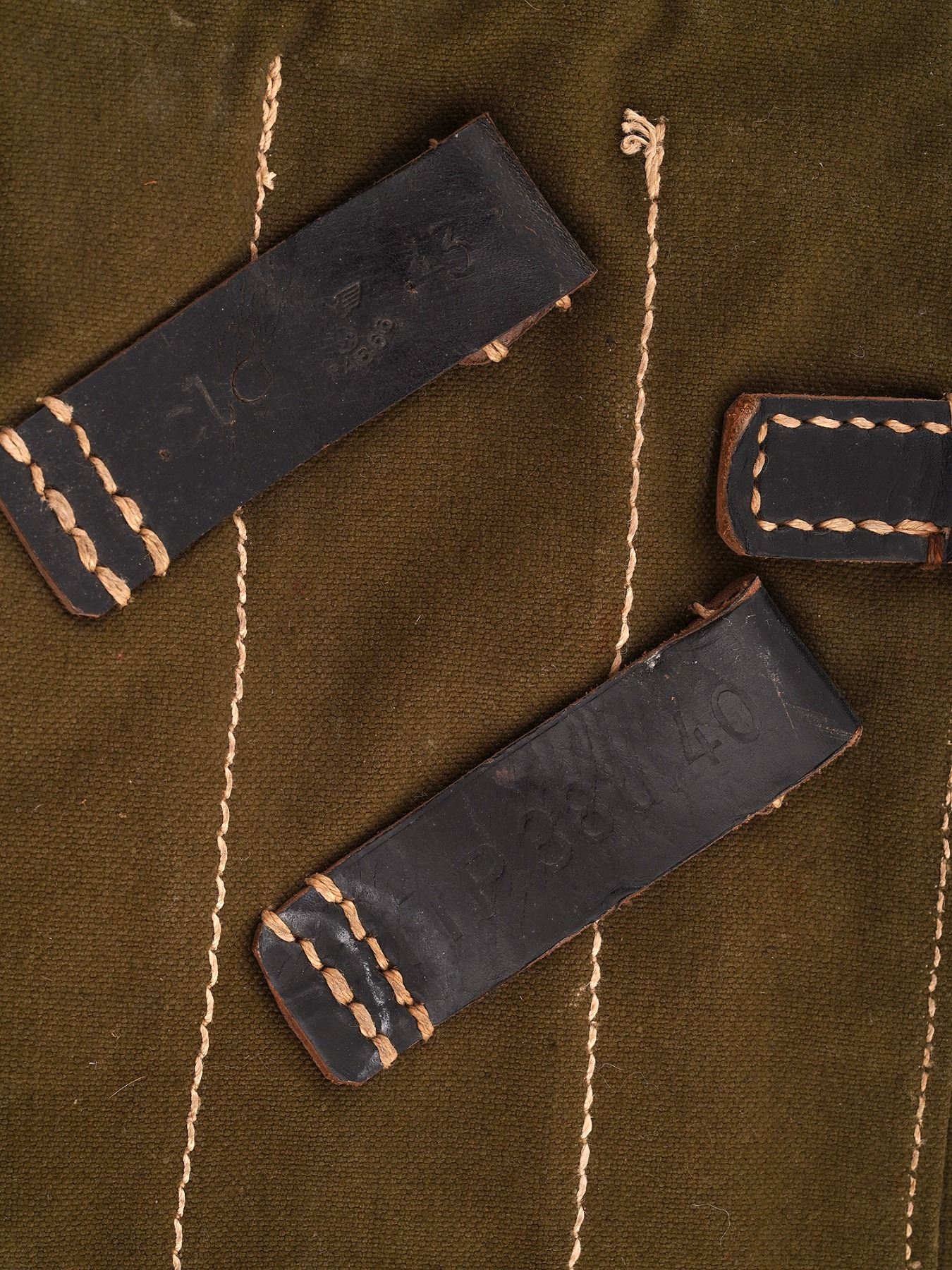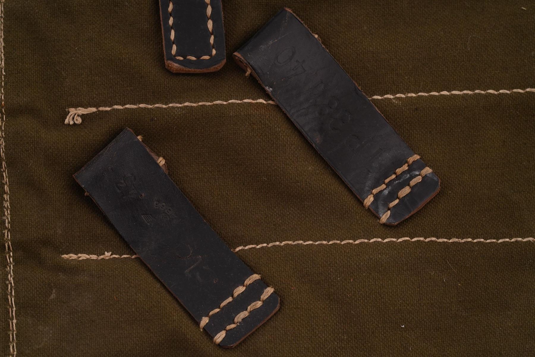 Set of green-colored three-piece canvas pouches for MP38/40 magazines. Diagonal loops for attaching to the shoulder straps, valve straps and their horizontal retainers are made of black leather. The metal fittings consist of D-rings and spurs.