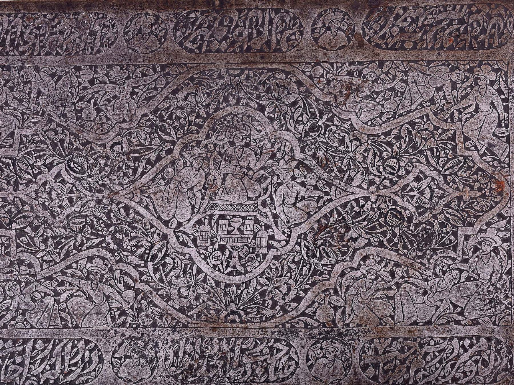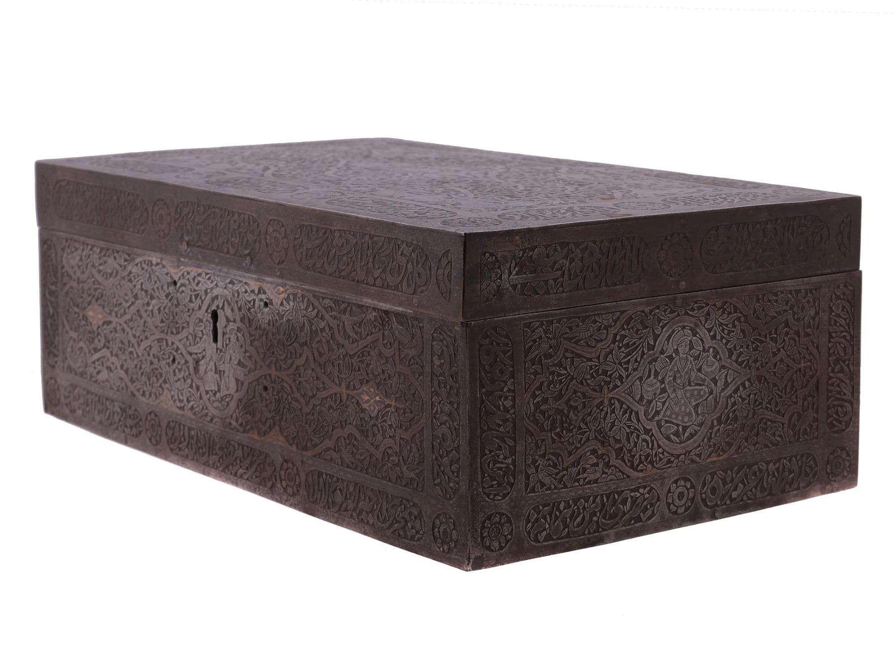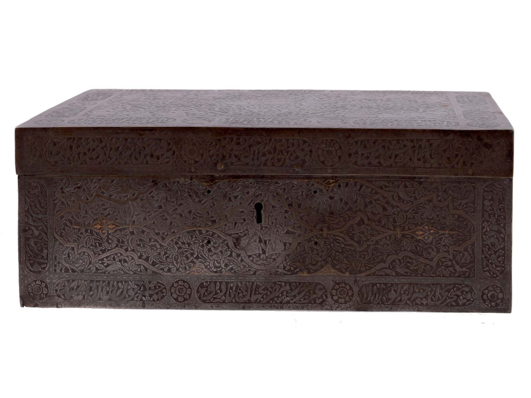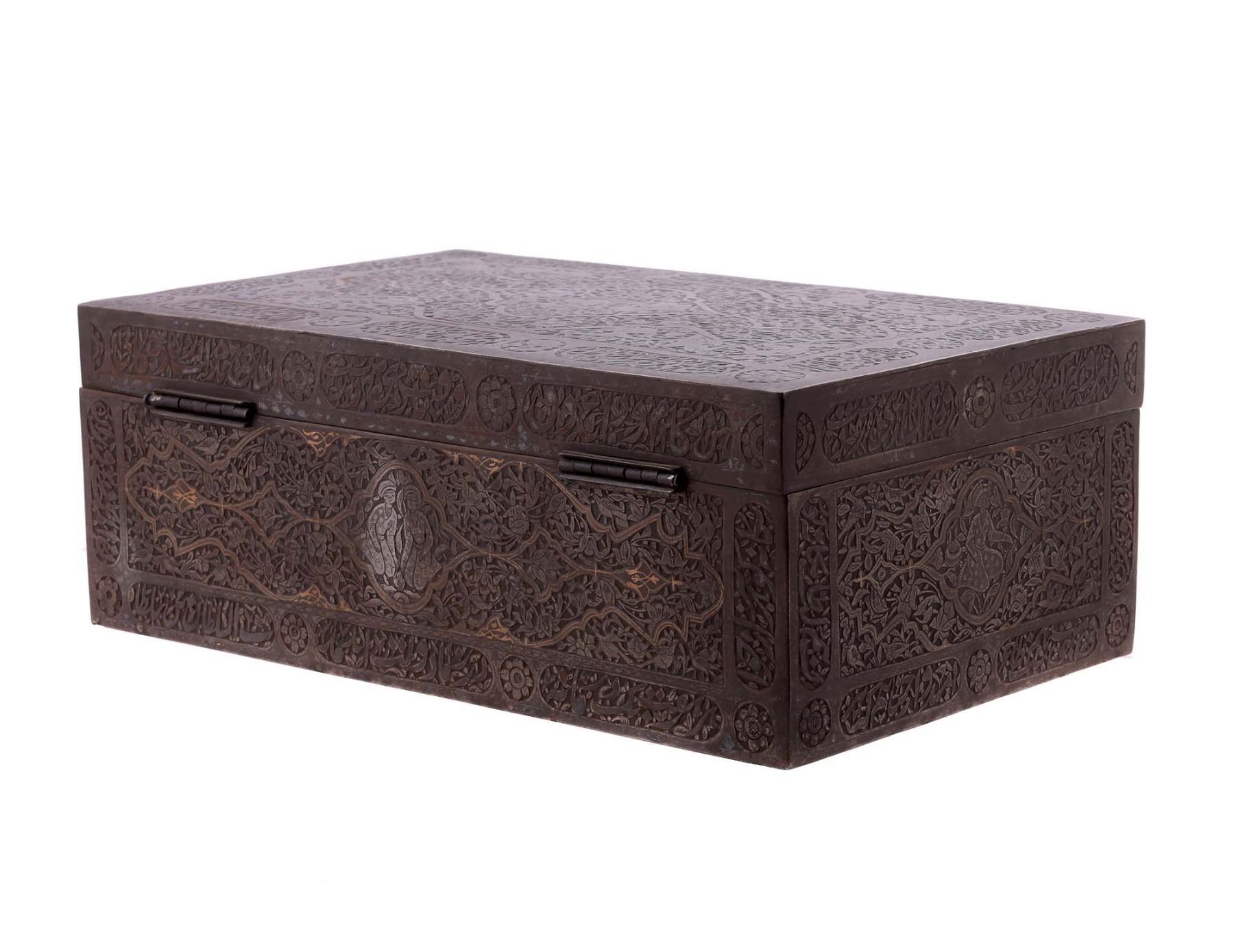 A rare Persian, Qajar period iron box entirely covered with etched decoration forming a characteristic Persian floral motif, calligraphy and human figures in cartouches. The box is made of hand-forged iron embellished with silver and gold inlay.