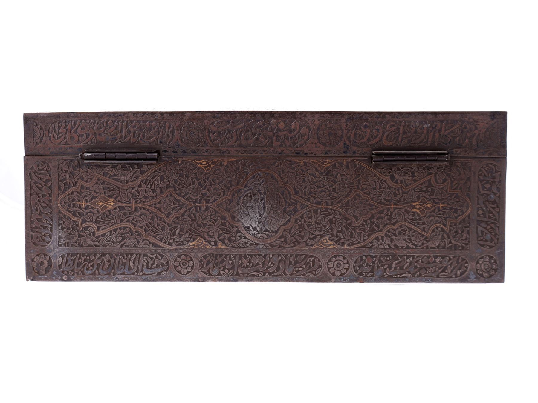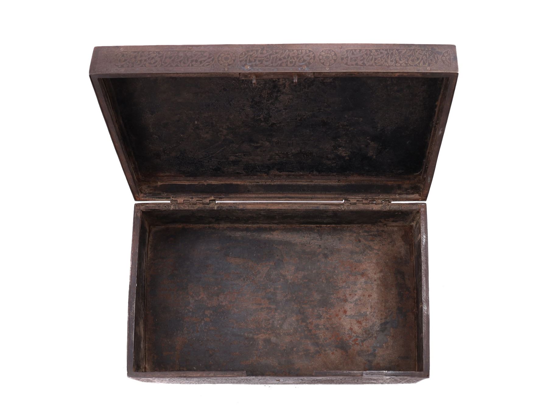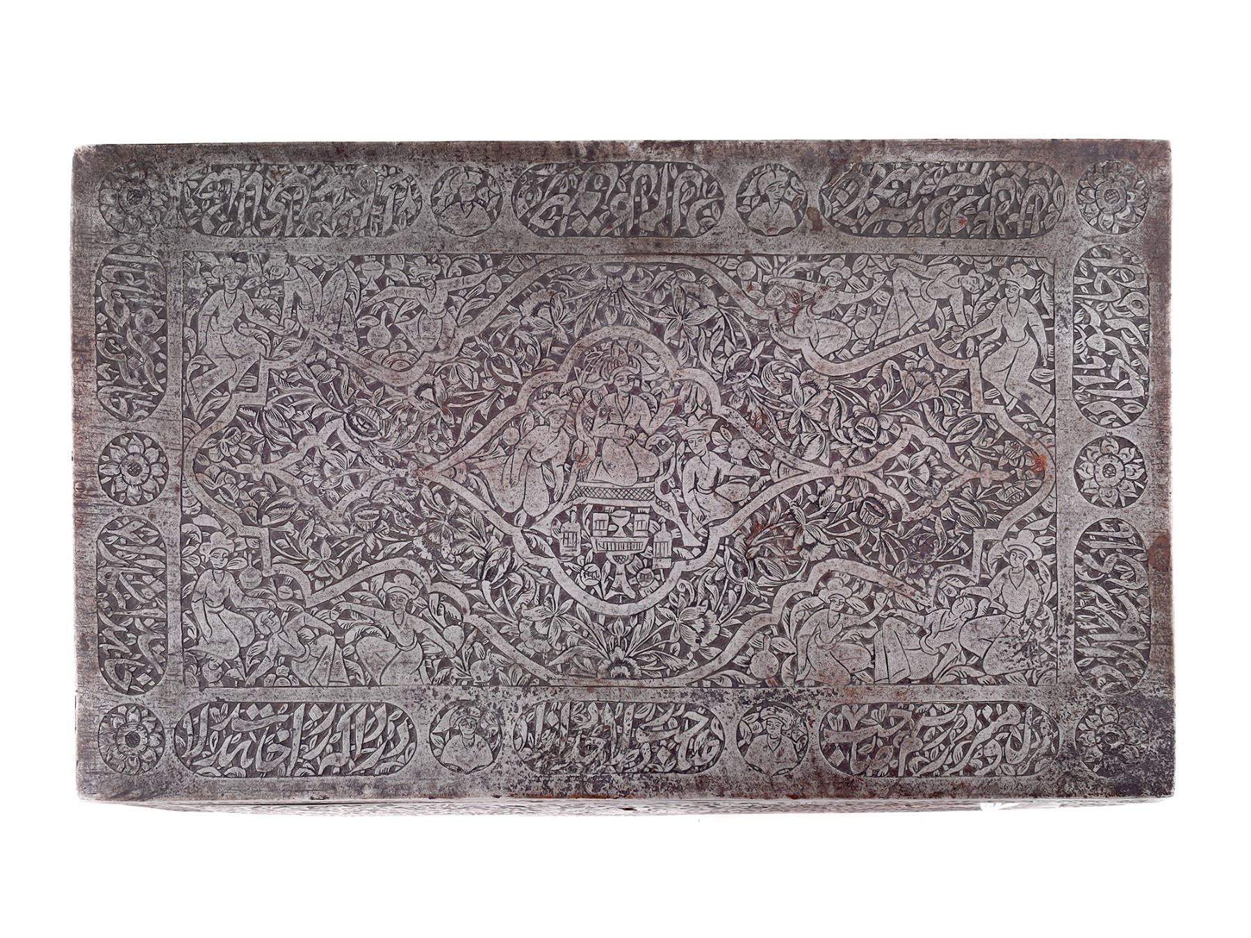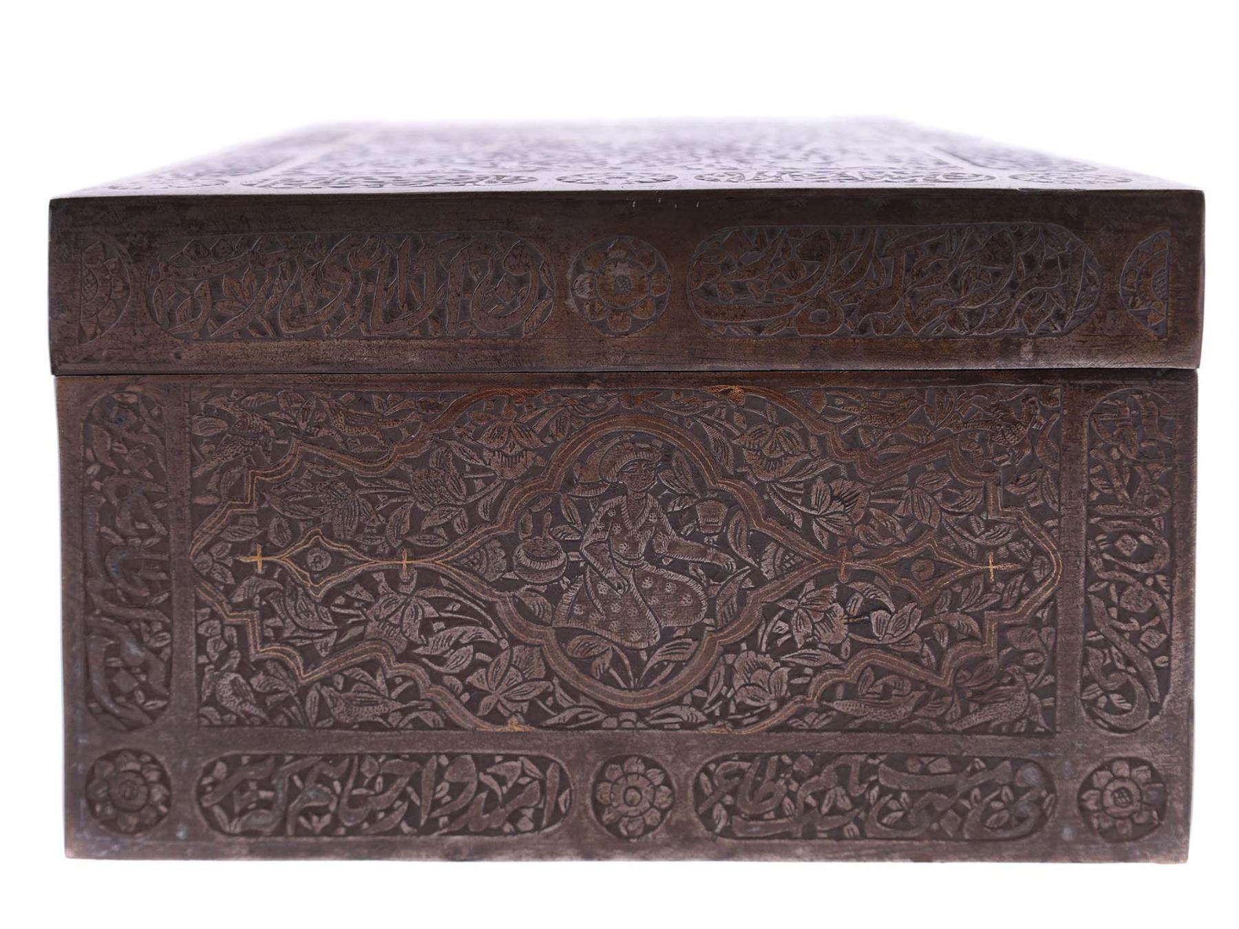 A RARE SILVER INLAID PERSIAN ENGRAVED IRON BOX, QAJAR PERIOD