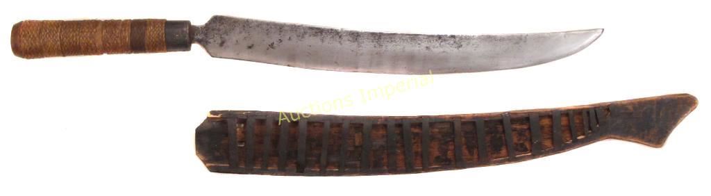 With rattan-bound wooden grip and native-wrought single-edged blade. In its scabbard with applied bands. Late 19th century. Light wear. Overall length 59.5 cm.