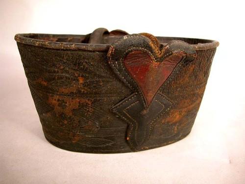 A RARE TOOLED LEATHER KEY BASKET; Probably Richmond Virginia, the handle tabs decorated with red hearts, the body ornamented with leaf, diamond and hearts, and lined with red paper, 4"h x 7-3/4"w x 6-1/2"d