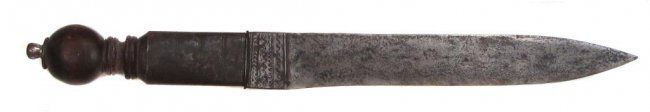 An archaic form with spherical wooden pommel and broad blade.Mid-19th century.Worn.Overall length 45.5 cm.