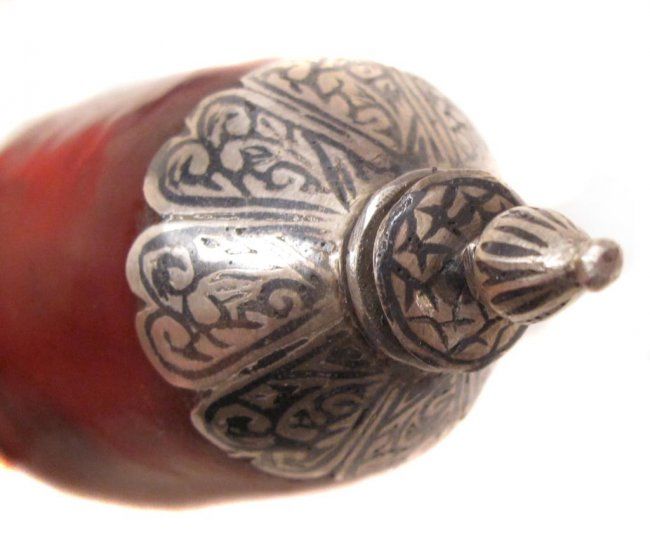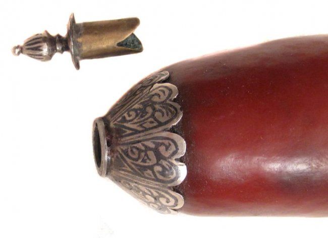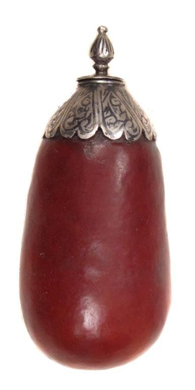 Formed of a polished gourd, with nielloed silver cap, the plug intact.Mid-19th century.Overall height 9.9 cm.