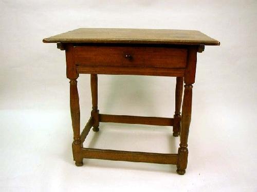 A RARE WILLIAM AND MARY GUMWOOD TAVERN TABLE; New Jersey, the lift-off top above a drawer, turned legs, molded stretchers and bun feet, 30"h x 34 1/2"w x 27"d