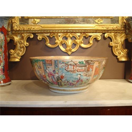 A Very Rare and Important Chinese Export Bowl, Circa 1760, the Qianlong Period, in Perfect Antique Condition. No breaks, cracks or repairs of any kind. Often times a bowl of this size can warp slightly in the firing process, this bowl made it through in perfect condition! Decorated in the round with un-interupted scenes of Mandarins pursuing idyllic pleasures in and around Pavilions in a Garden set near a stream, with Vast landscapes in the background. The Colors are bright and clear and the Figures are all rendered with the highest level of refinement, clean and crisp, not hurried and sloppy like many poorer quality examples. The interior of the bowl is simply decorated with a delicate repeating band near the top rim, and a simple spray of flowers in the center. This Bowl will be Professionally Wrapped and Packed in a Custom built box, with Full Insurance and Signature upon reciept.