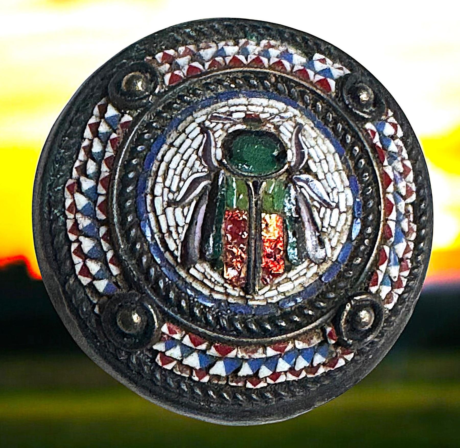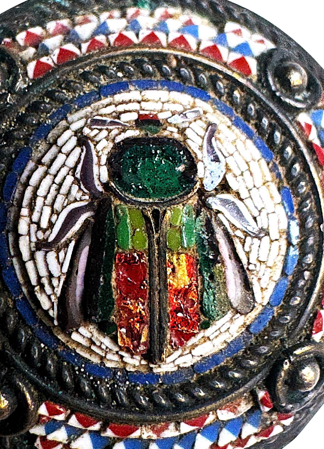 1 Medium size late 19th century colorful Mosaic example. This stunning button came from the Paula Norby collection. The design depicts in Micro Mosaic in the center a multi colored insect surrounded by white glass tesserae glass mosaic along with 5 border of inlay and silver cabochon style OME, all set into a silvered mounting. Micro mosaics like this a re rarely seen for sale. All the glass tesserae appears to be intact and the button in in fabulous condition.. Fabulous button.
