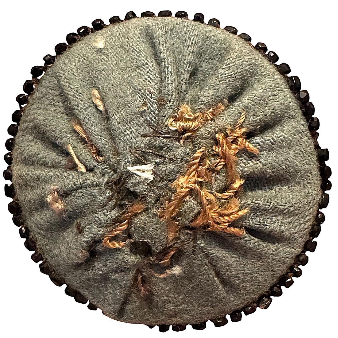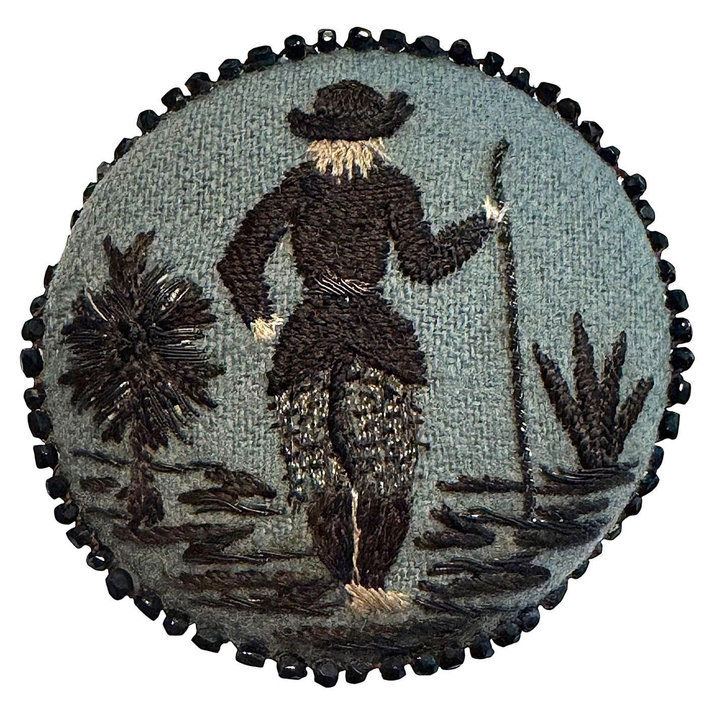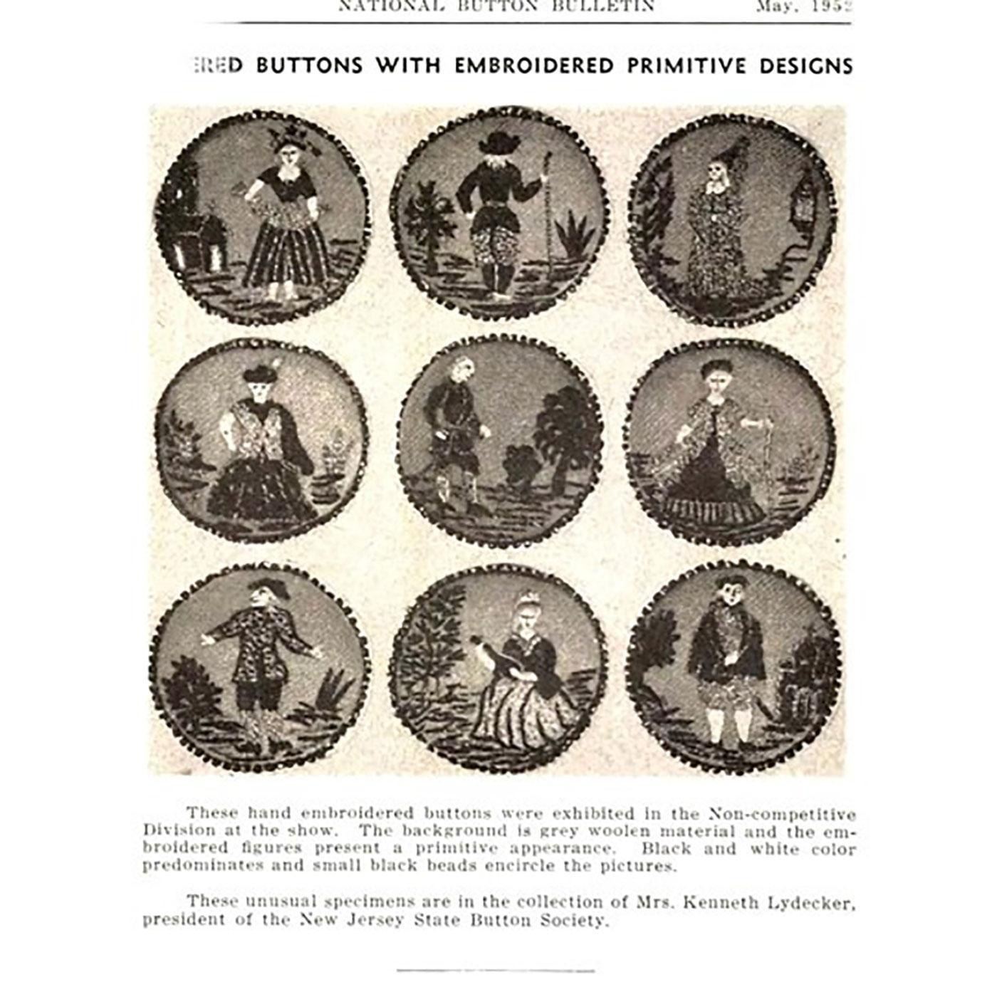 1 Large 18th century embroidered fabric male figure button. We have once again been entrusted to bring you two more of these exquisite and rare fabric pictorial buttons from the consignor as they were pleased that the button collectors appreciated the ones sold from the set in our November 2024 auction. These two constitute the only further examples they will be selling in our auction so if you want to acquire one of these rare examples now is your opportunity. This incredible button from the 18th century was all hand made and the craftsmanship and detail is stunning. To find a button or buttons like this in this outstanding condition in this material is also incredible. This button has not been seen for sale since the 1940's and came from a set owned by the late Eugenie Lydecker who was a President of the New Jersey Button Society in the 1950's.Her collection was sold in 1980 at auction but this was not in the auction as it came to us from the granddaughter of Mrs. Kenneth Lydecker. If you want to own a pierce of history and fine craftsmanship of the late 18th century, this is an opportunity to do so, We cannot stress enough the rarity and fine condition of this example. Attached to this description is an image in the September 1952 National Button Bulletin showing the entire set of these buttons belonging to the Lydecker collection.
