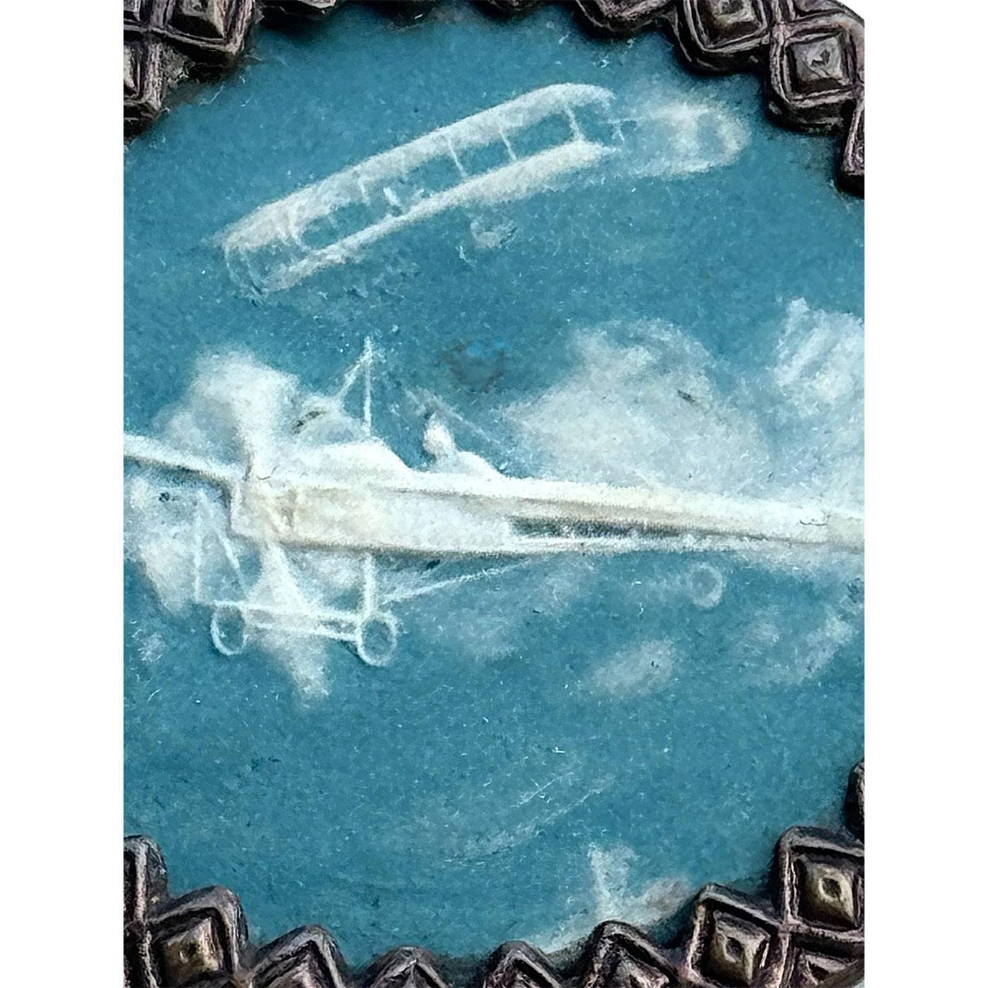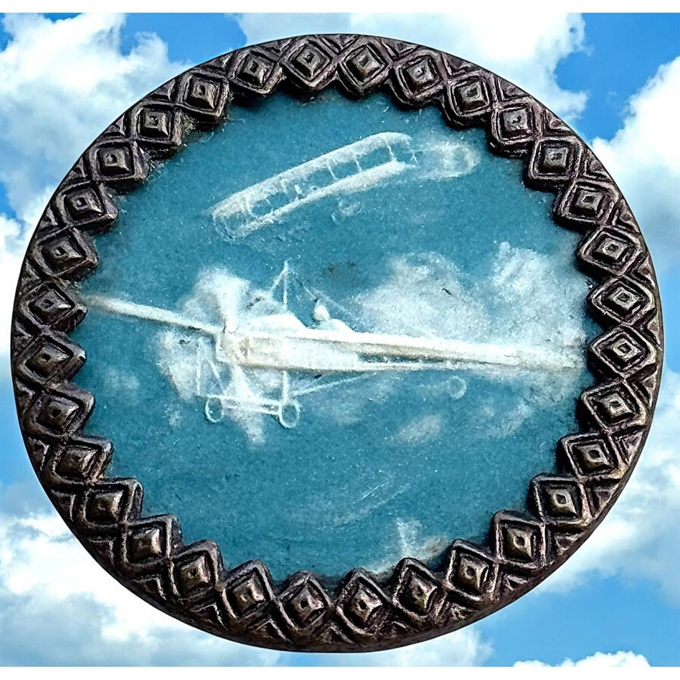1 Large medium 1 1/4" early 20th century button of two airplanes. This incredible button from the collection of the late Jean Young of California depicts an Orville Wright airplane above and a second airplane with pilot below. The faux Wedgwood glass? We believe, is finely detailed and set in a brass mounting typical of the time. This is an extremely unusual button and we have never see anything like it before. Jean's note on it was that it was a button purchased by her mother in the 1940's from Lillian Smith Albert of New Jersey. Very cool example indeed. Our estimate is possibly high or possibly low as we have no comparisons to this unusual button.