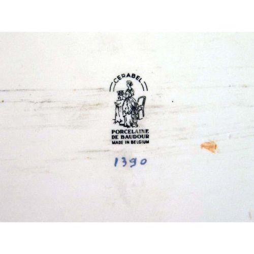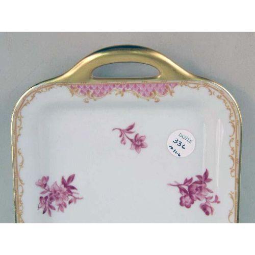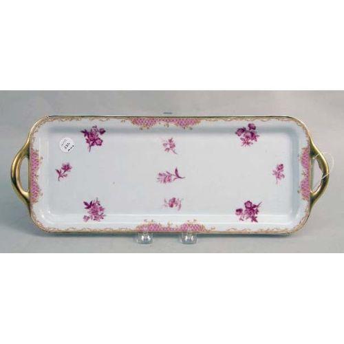 A RASPBERRY AND PARCEL-GILT DECORATED PORCELAIN SANDWICH TRAY<BR><BR>Marked underside, Cerabel Porcelain, made in Belgium, 15-1/2"l
