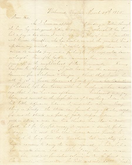 Fine content war date A.L.S. "W.S.W." 3pp. 4to., Richmond, Va., March 29, 1865. Identified in pencil as William S. Wall, the correspondent was a recently released Confederate P.O.W. who provides a good account of his return from captivity as well as a superb and unusual account of life in the Confederate capital just before the evacuation of the city. Wall writes two days after his release, in part: "…Richmond is a gay place, and except in the high price of every thing, I can see but little difference between it and other cities. Every thing is plenty. The stores can furnish any article called for, and the streets are full of gaily dressed ladies. For gold, or silver, a man can live cheaper here than in New York, but for Confed. money it requires a small fortune a day. It used to be, that persons carried baskets to market to bring home their purchases, but now they find baskets necessary to carry the money required. I have, but a few minutes since, had a plate of very fine ice-cream in as fine and well furnished saloon, as can be found in Cincinnati, or Louisville. The bill was only $5.00 (cheap). There is no fighting, particularly going on, along our lines, now, nothing more serious than an occasional skirmish. In the little affair near Petersburg the other day, we trounced the Yankees finely… I have seen none of the dejection, and scare, among the citizens of Richmond, which Northern accounts led me to expect- on the contrary, business is just as brisk, and the people just as lively, as if Grant's Army was a hundred miles away. If there is any intention to evacuate Richmond, it requires some one better posted than I am, to see any of the indications. I can't see anything that looks like it. I thought I had seen fortifications and buns before, but I must acknowledge that until I came here, I had seen but little. There are guns enough to fence in half of Harrison County … Of my trip from Prison … but as my last letter had to pass through the hands of an Inspector couldn't say much more than that we were well treated … The guards it is true did treat us, or rather those of us who had a little money, better than we expected. The officer (a little, excitable Dutch lieutenant…) put us to all the discomfort he dared - closed car doors and windows when wherever we stopped at a station, would not allow us to speak to citizens, and drove off all the pedlers &c. that came near us - frequently refused to allow us to have water, when the men were almost suffocating with thirst … It was almost as bad as remaining in Prison. The Yankees would not generally allow us to buy bread & pies &c. from the pedlers, but would buy it themselves, an let us have it, at double, or treble cost. At night, when we would lie down in the heat to sleep, they would steal the boys hats & blankest &c. and many poor boys came around bare headed… " Some toning along folds, else very good.
