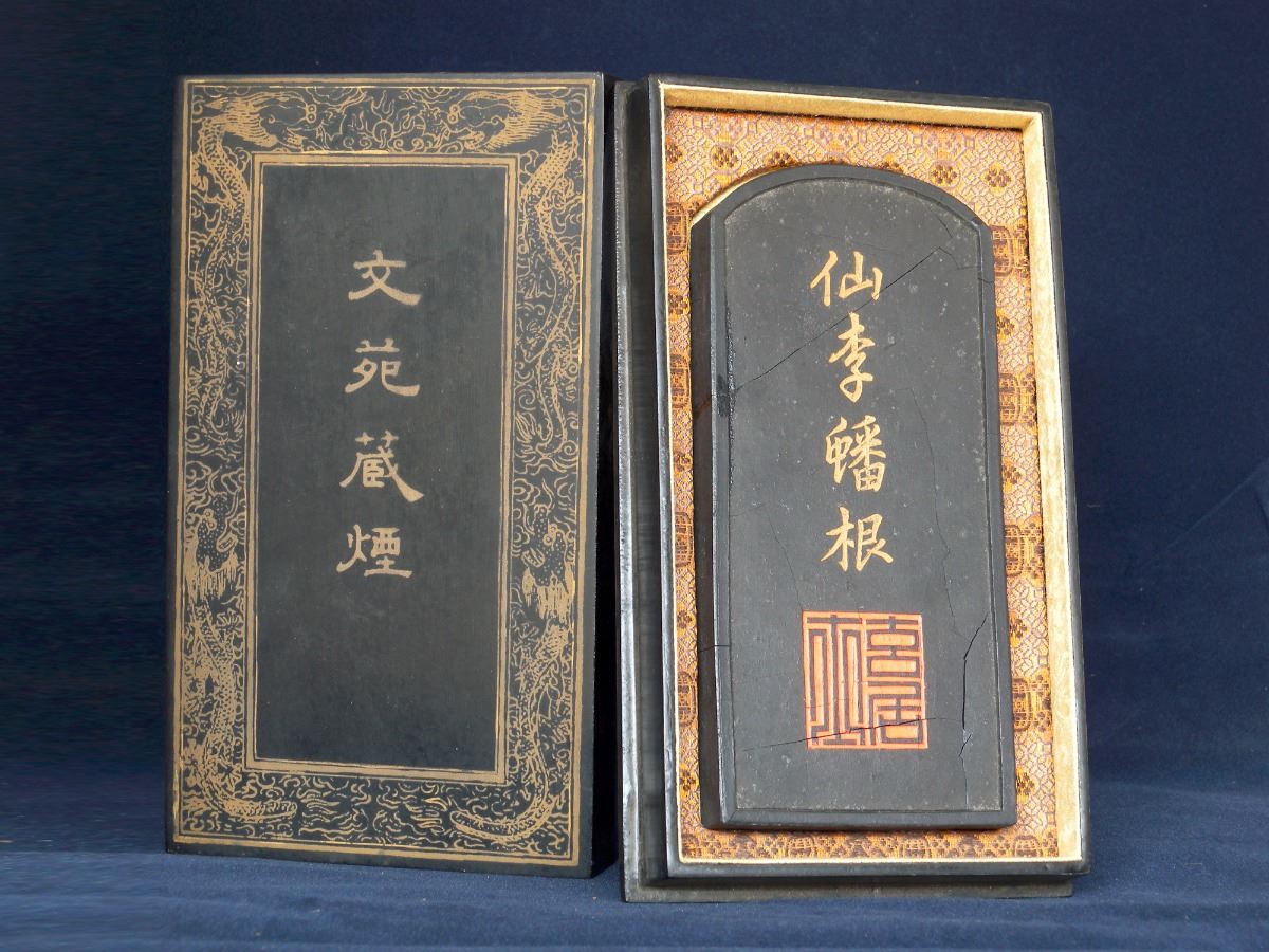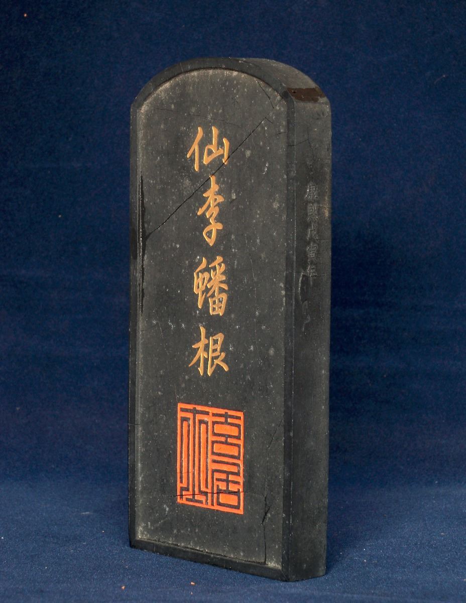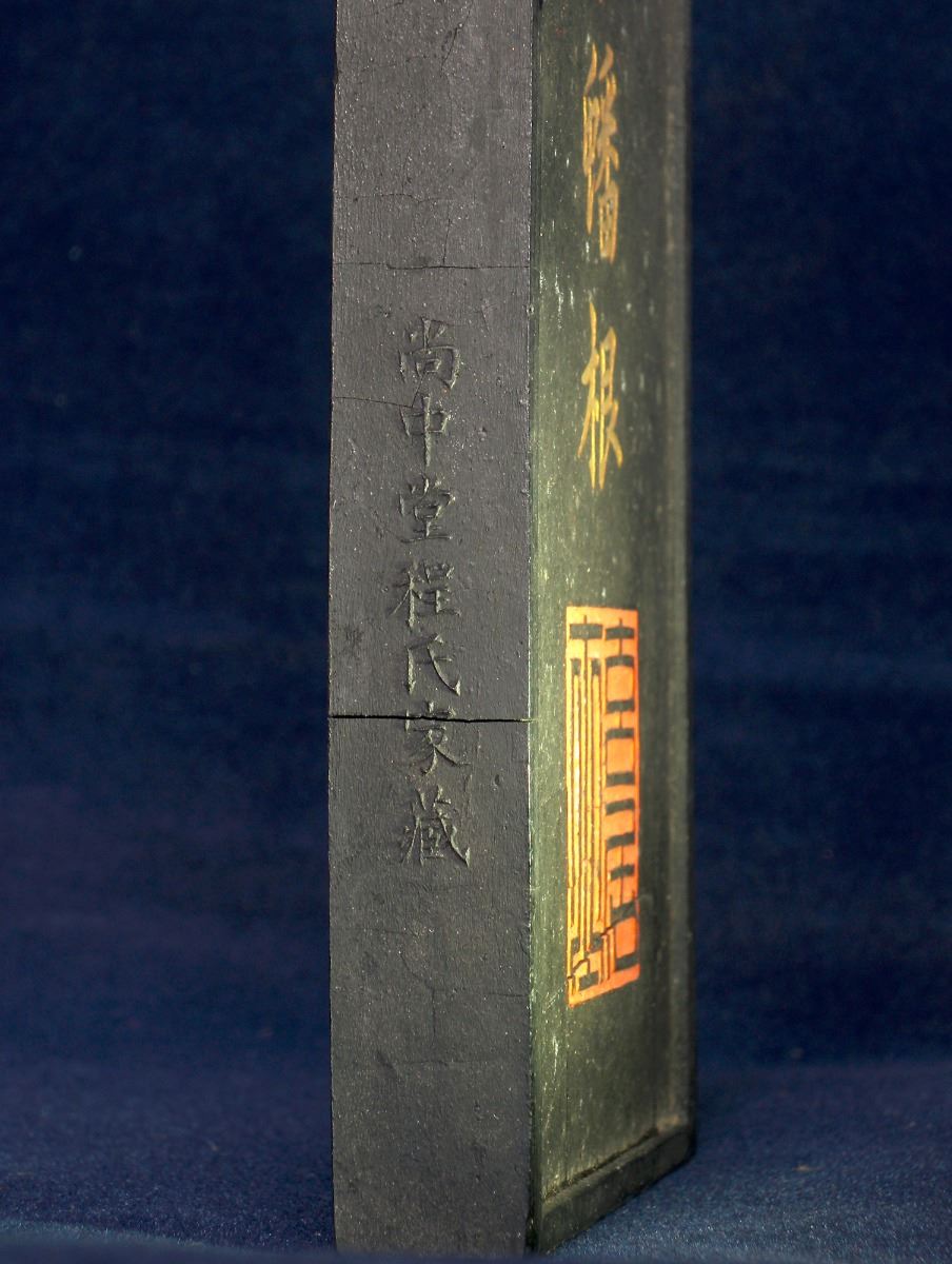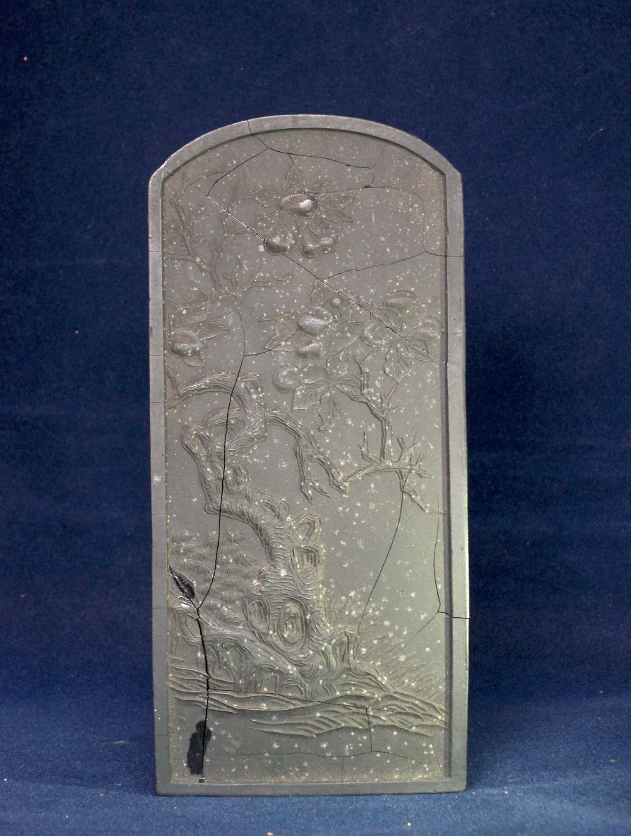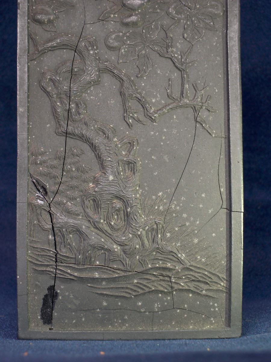 A RECTANGULAR CHINESE INK with round top rim and shallow relief of trees, Cheng family collection mark. Visible crackes. 6.75"×3"×0.75"