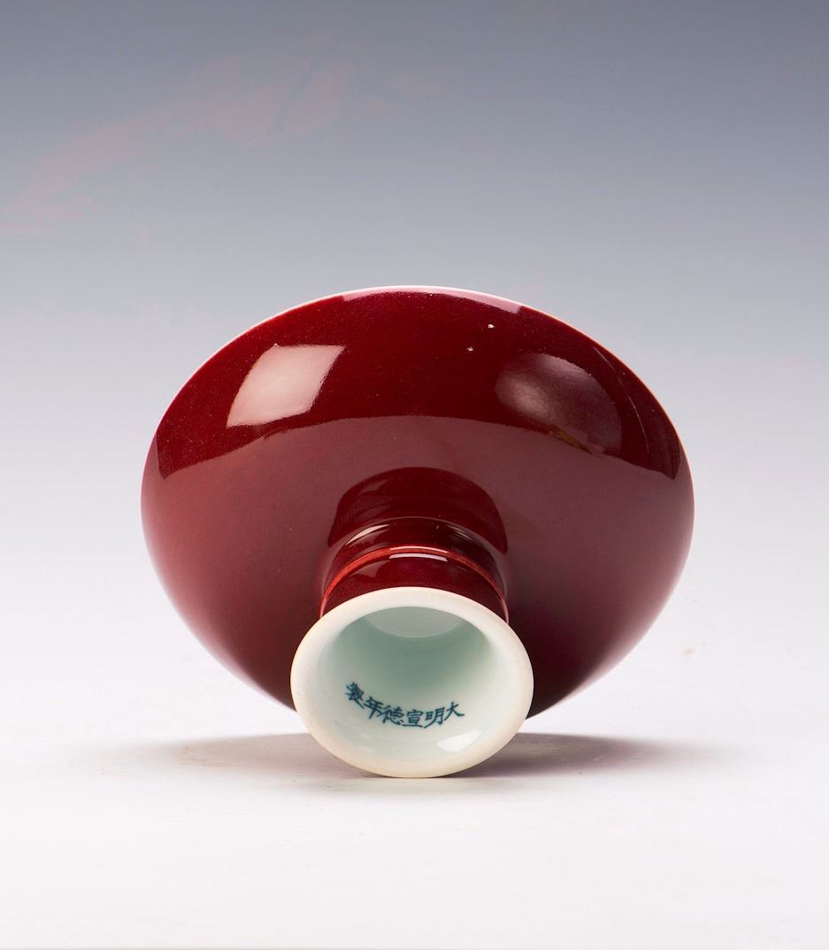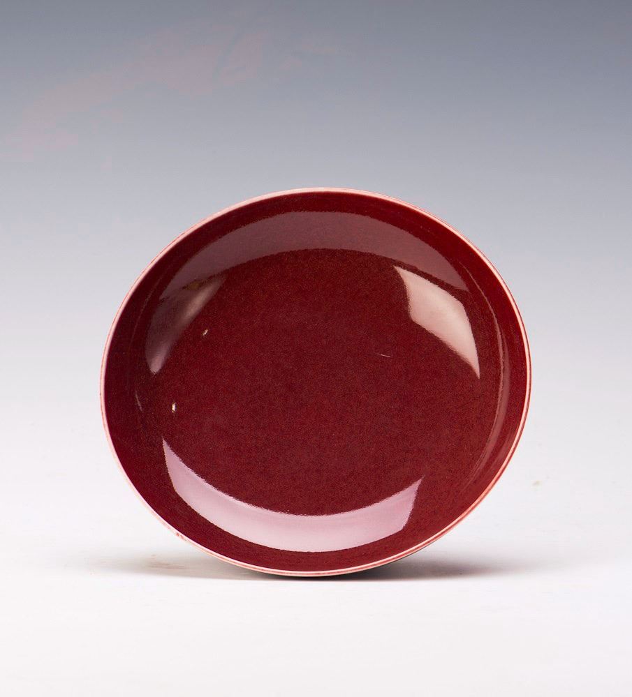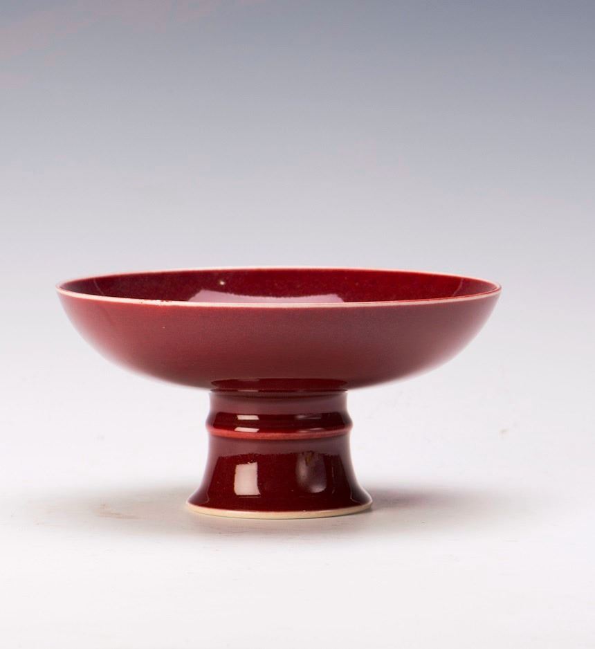 A red glazed porcelain bowl with tall foot. Diameter 7.25" Height 3.5"