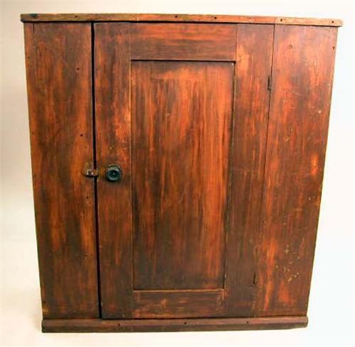 A RED STAINED MAPLE HANGING WALL CUPBOARD; New England, of rectangular form with the cupboard door opening to reveal an interior fitted with two shelves (restored) 42"h x 38 1/2"w x 12"d