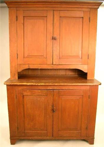A RED STAINED PINE STEPBACK CUPBOARD; New England, in two parts, with overhanging cornice and cupboard doors opening to reveal a mustard color interior with shelves, (wear and abrasions throughout), restorations to feet 6'6"h x 4'3"w x 21"d