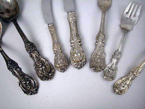Comprising eight each dinner knives, dinner forks, and salad forks, sixteen teaspoons, six flat handled butter spreaders, one serving spoon, and one sauce ladle. Weight approximately 55 T.O. weighable.