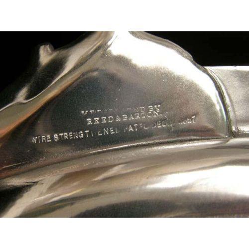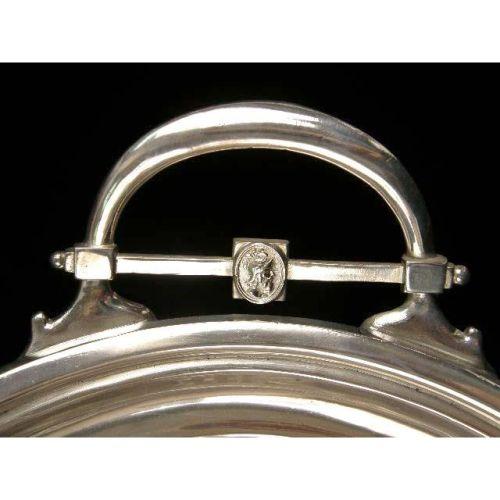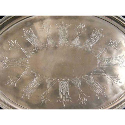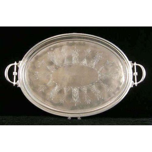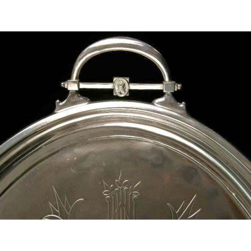 A REED & BASTON SILVER PLATED AESTHIC MOVEMENT DOUBLE HANDLED OVAL TRAY<BR><BR>With medallion plaque decorated handles and stylized papyrus motif surface, 32" over handles x 20"wide